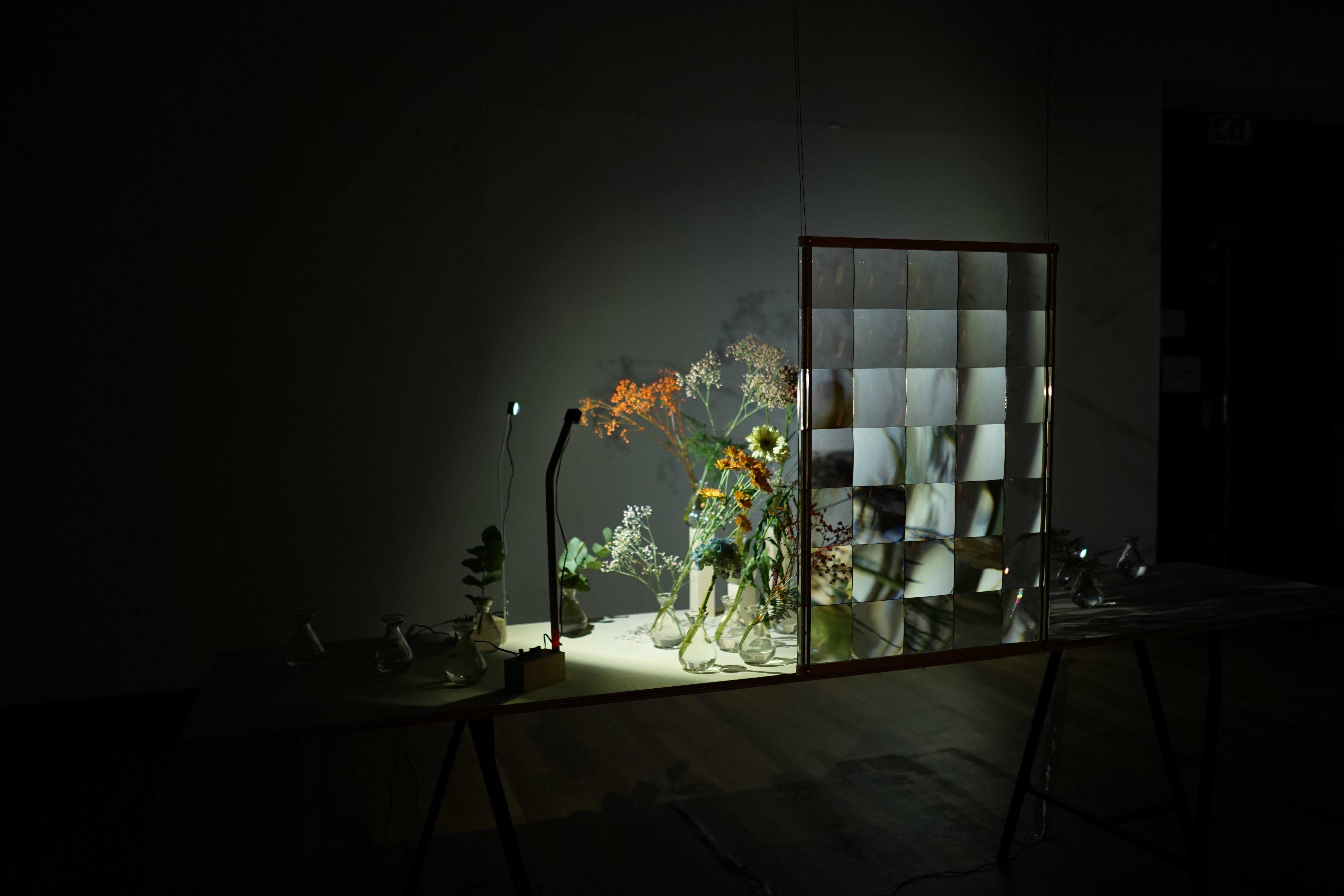 The lens, cut into small pieces, was put back together using the kintsugi technique, with lacquer. ‘Kintsugi involves repairing a broken object using urushi lacquer as an adhesive, and by marking the fracture line with powdered gold’, the designer explains to Pen. This lens, placed in front of a bouquet of flowers, gives a new dimension to this rustic installation, whereby the petals appear gigantic, as if placed under a magnifying glass, and the vases are fragmented in the manner of a kaleidoscope. This disturbing impression is accentuated further by the fact that the room is plunged into darkness, the bouquet being lit only by two spotlights.