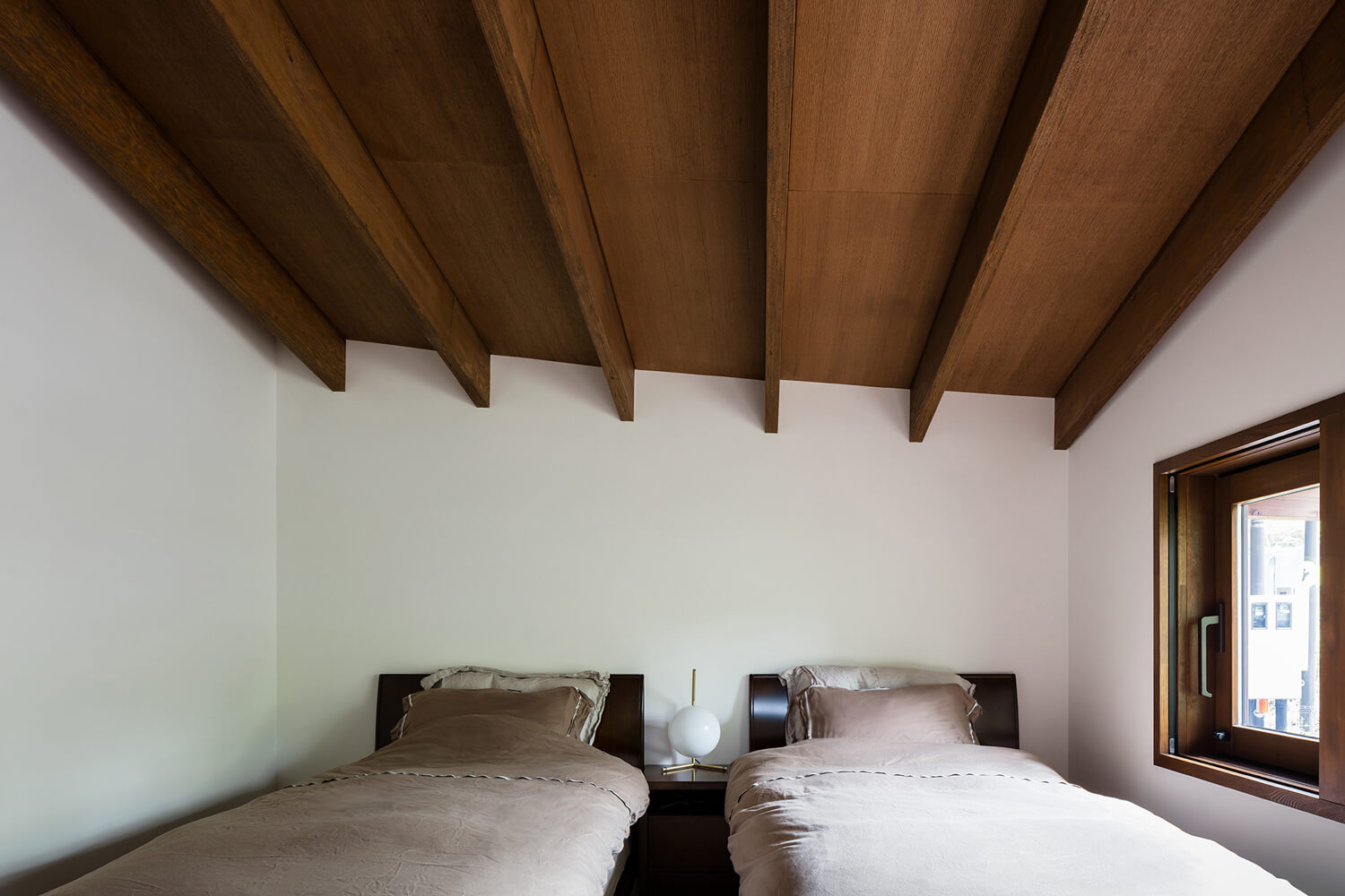 Through this system, the orientation of each room was carefully selected, without any need for compromise. The living/dining room faces southeast to capture the daylight, while the west-facing rooms overlook the forest and offer a more intimate atmosphere. The wooden materials and white colour scheme chosen for the interior décor extend the feeling of the serenity of the space.