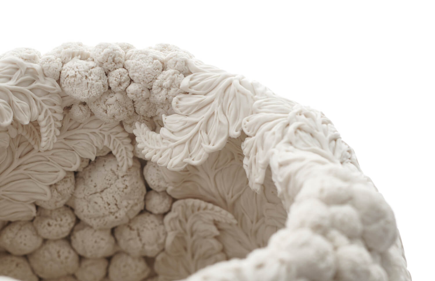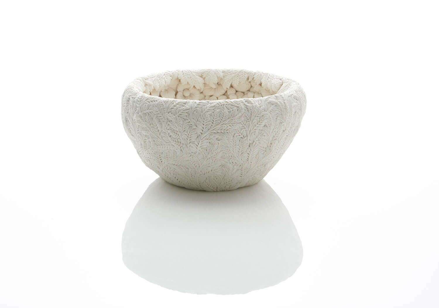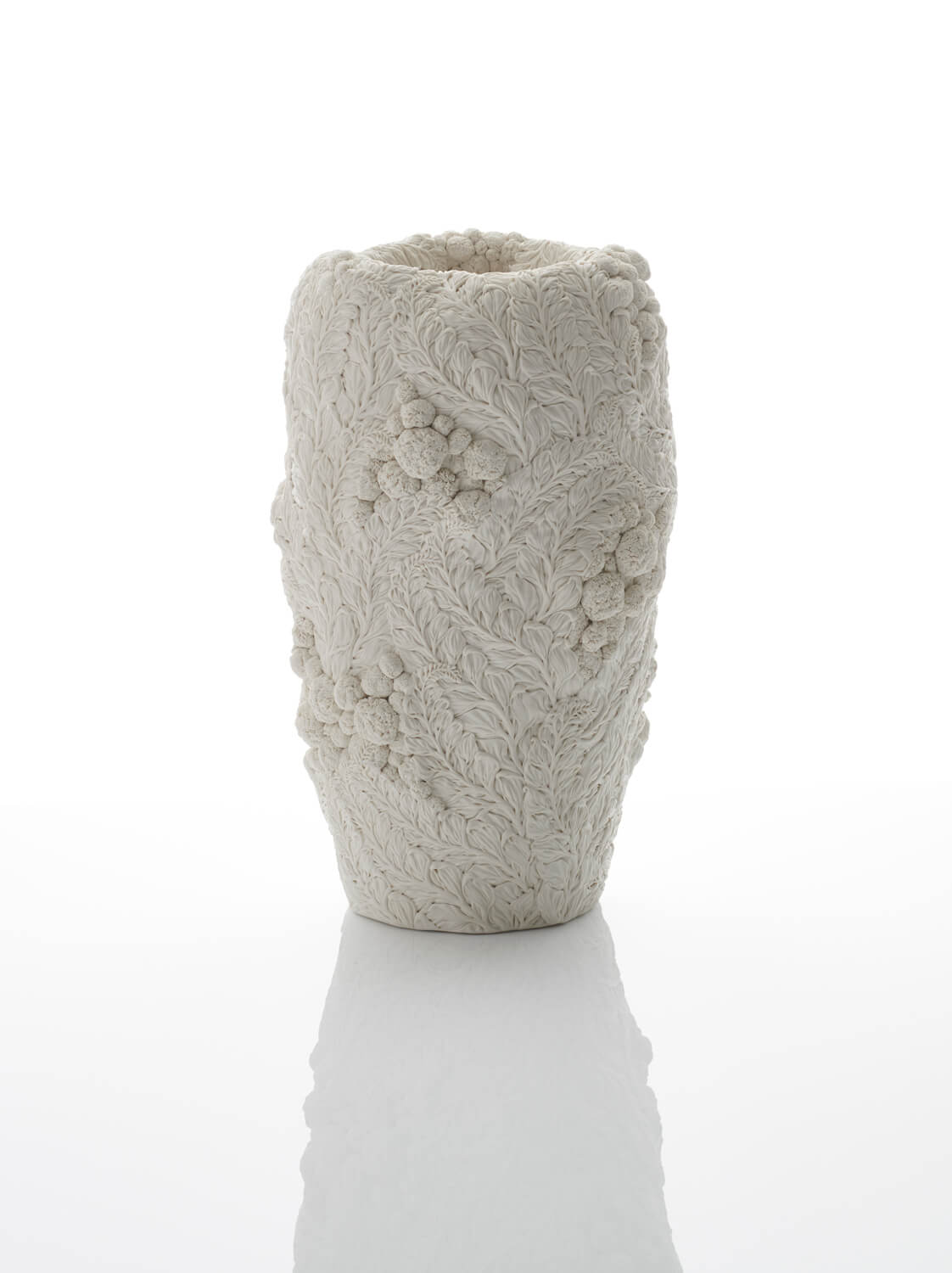 During an internship at the prestigious pottery Wedgwood, founded in 1759, the artist learnt the ancient technique of sprigging, a moulding technique that allows for subtle embossing on ceramic objects. Great precaution has to be taken so that these objects, some of the details of which require days of work from a single artisan, can leave London, but this hasn’t stopped the winner of the Salon des Arts Perrier-Jouët prize from exhibiting regularly in Paris and New York.