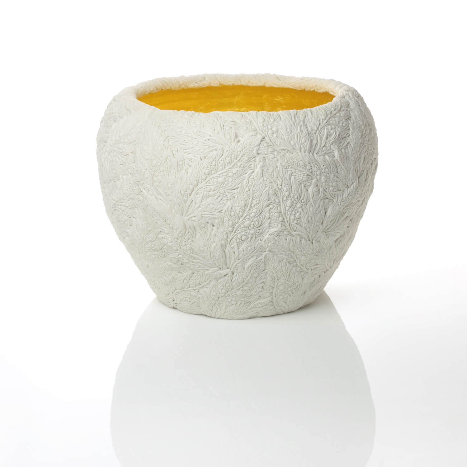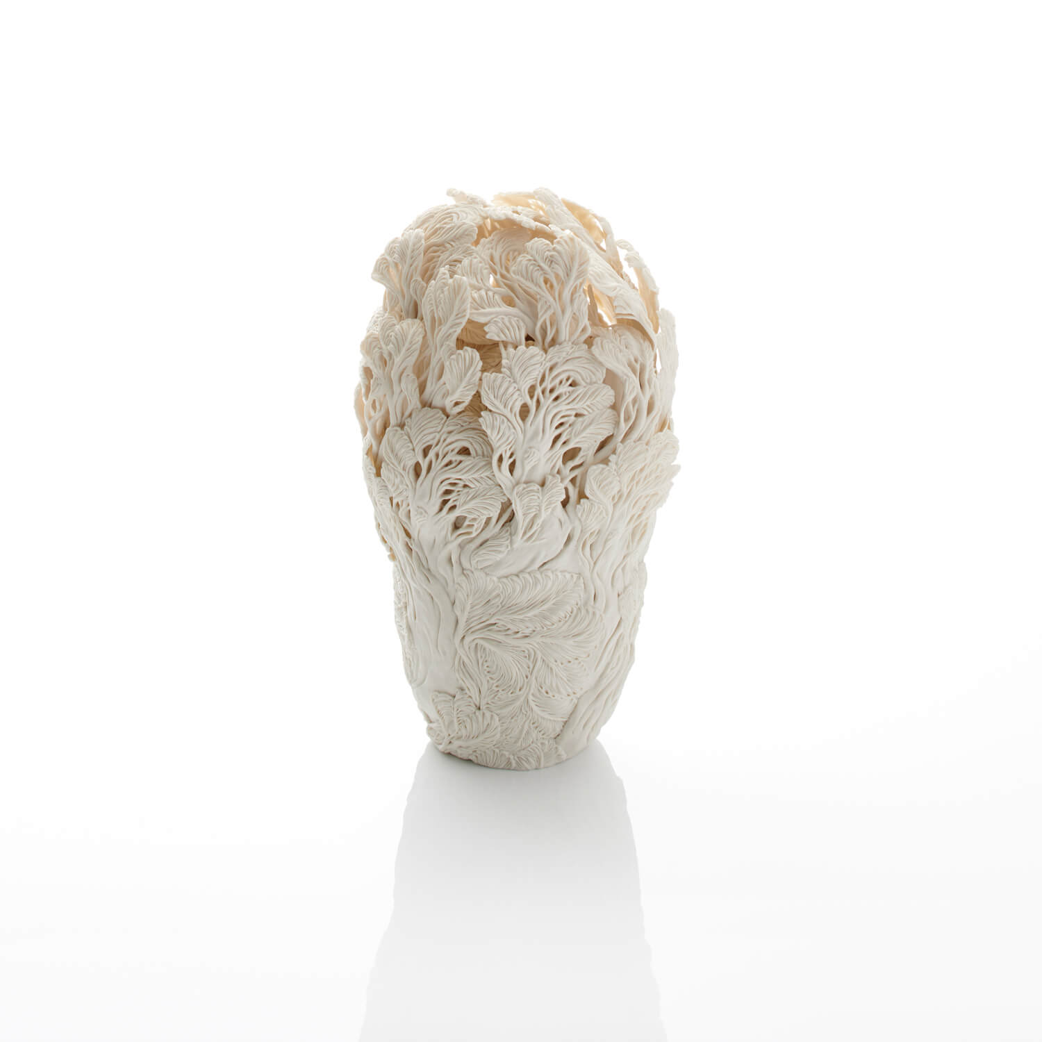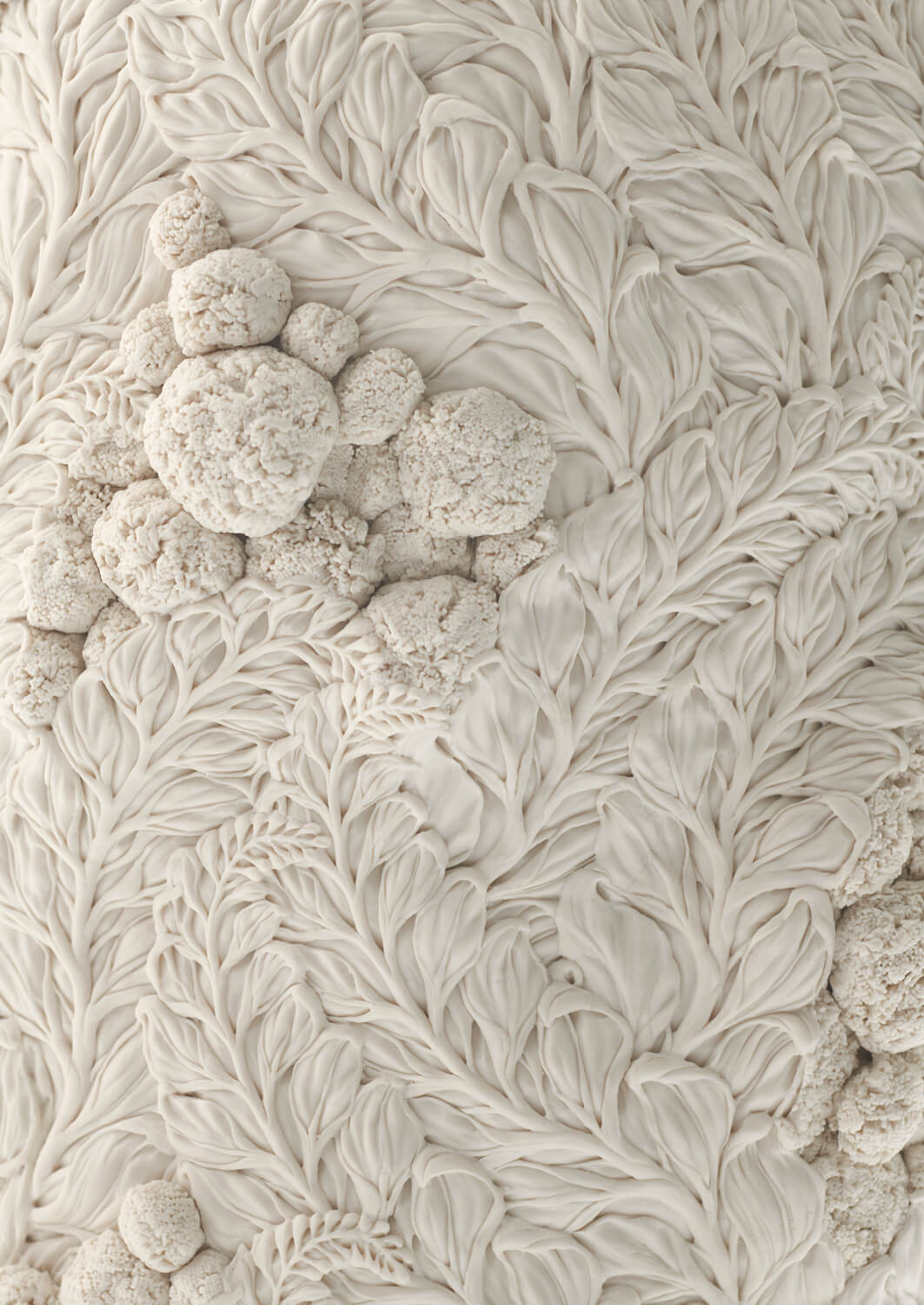 During an internship at the prestigious pottery Wedgwood, founded in 1759, the artist learnt the ancient technique of sprigging, a moulding technique that allows for subtle embossing on ceramic objects. Great precaution has to be taken so that these objects, some of the details of which require days of work from a single artisan, can leave London, but this hasn’t stopped the winner of the Salon des Arts Perrier-Jouët prize from exhibiting regularly in Paris and New York.