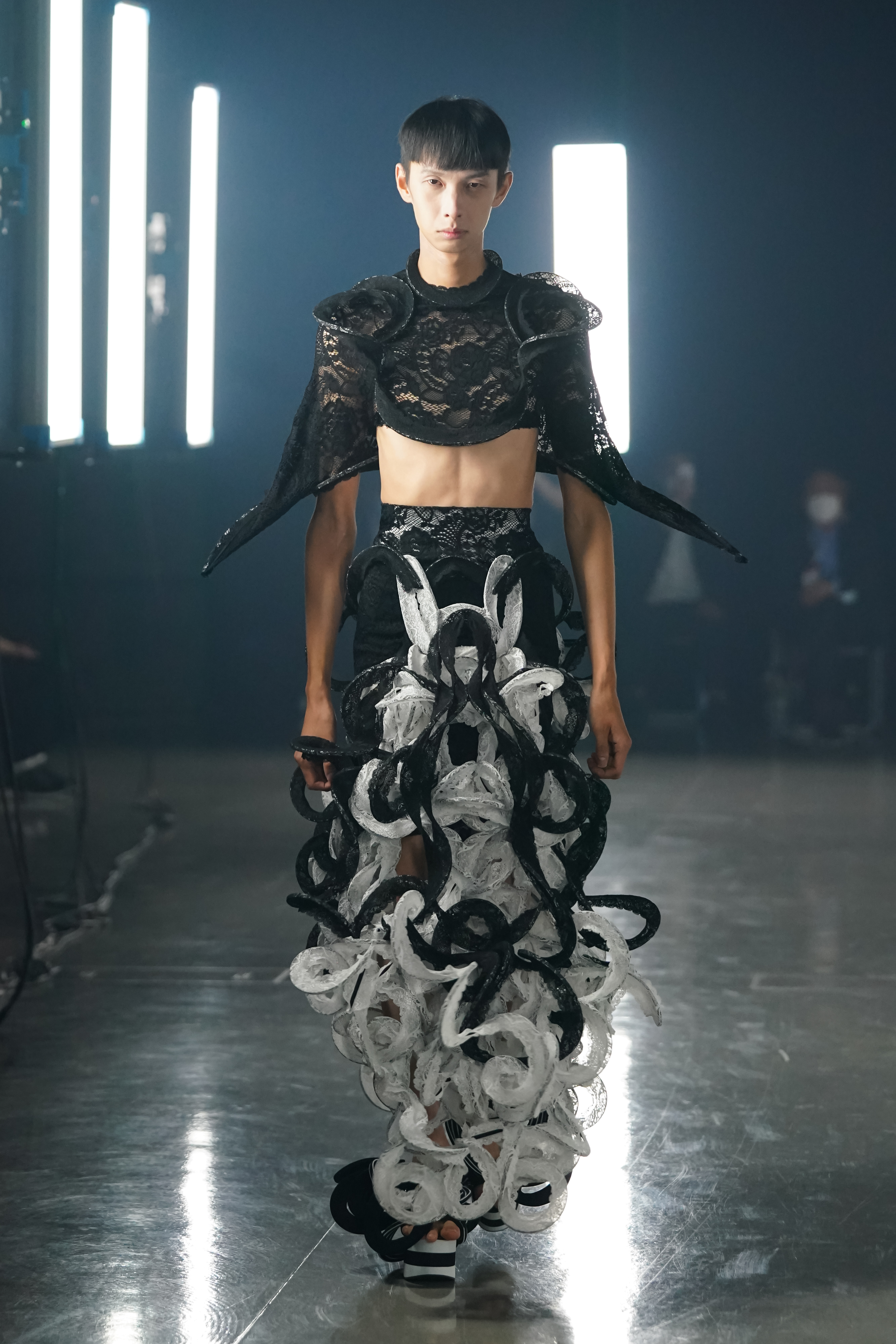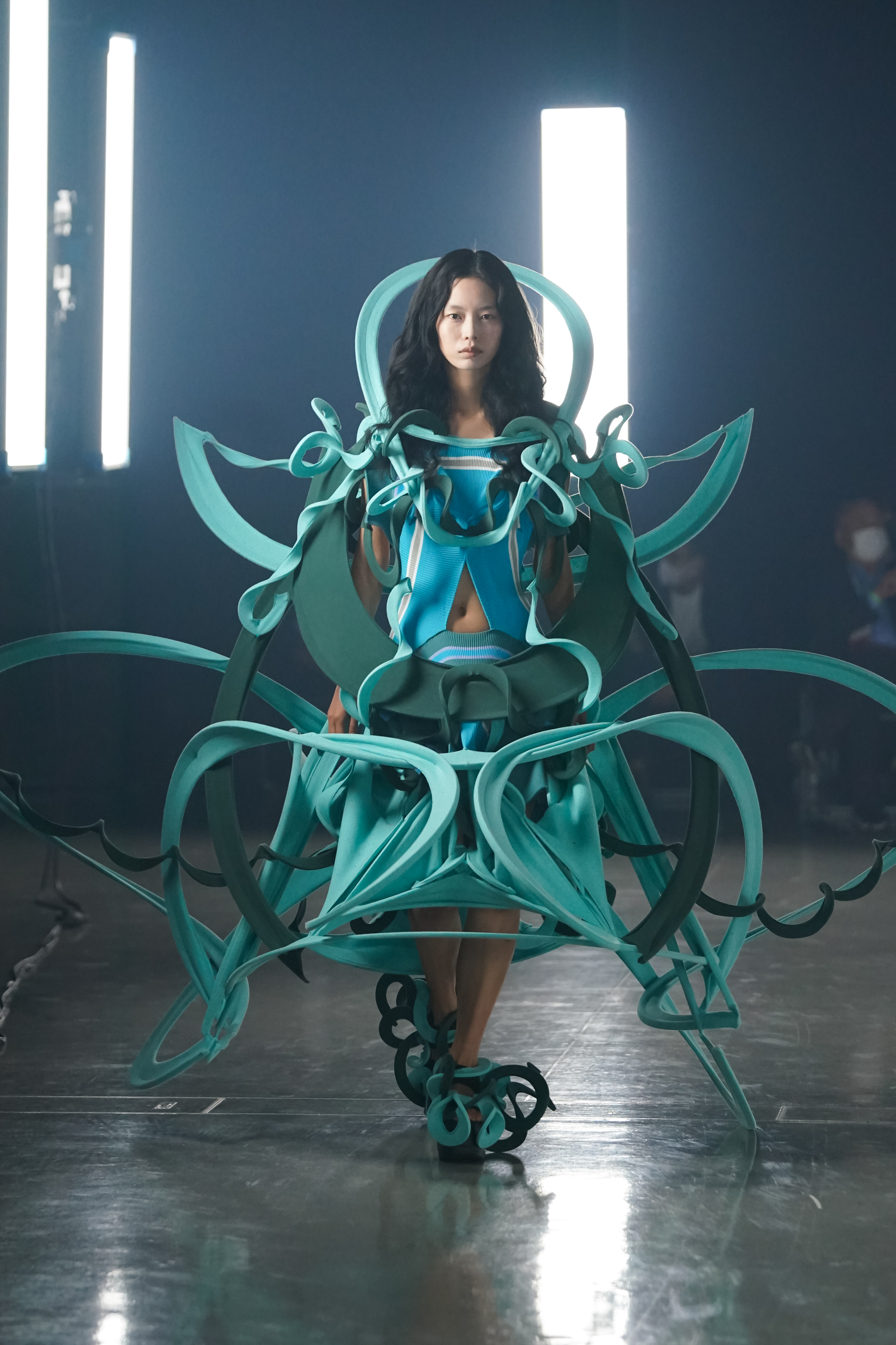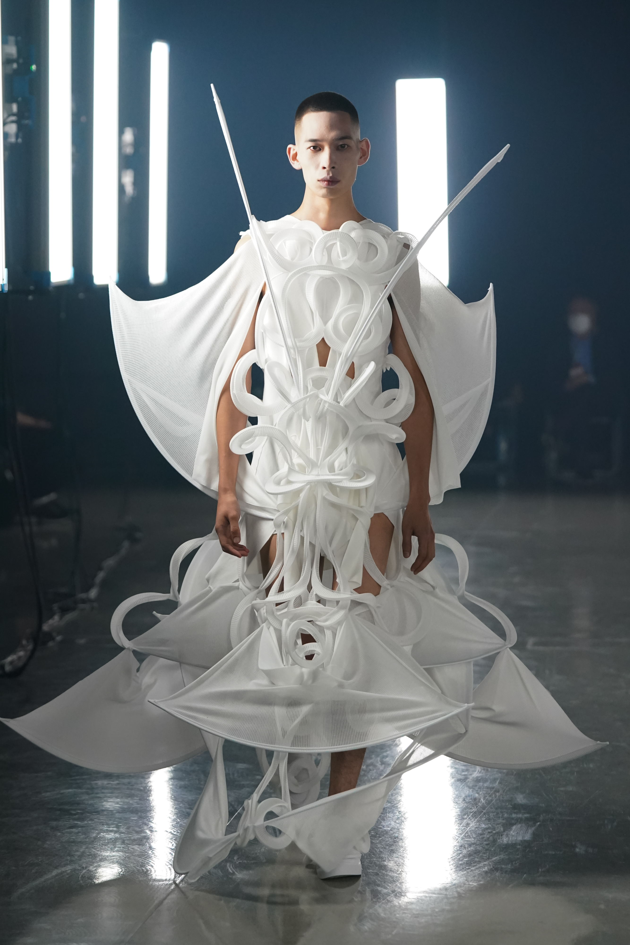 But the forms in fact correspond to an archaic lineage, informed by the religious ornamentation of Jomon-era Japan (a prehistoric period between 4,000 and 300 BCE) and the chromatics of Shintoist symbolism. As his hallucinatory garments have gathered international attention, the Tokyo Fashion Week newcomer stole the limelight in his 2022 Spring Ready-to-Wear collection with its boundless movement erupting from material.