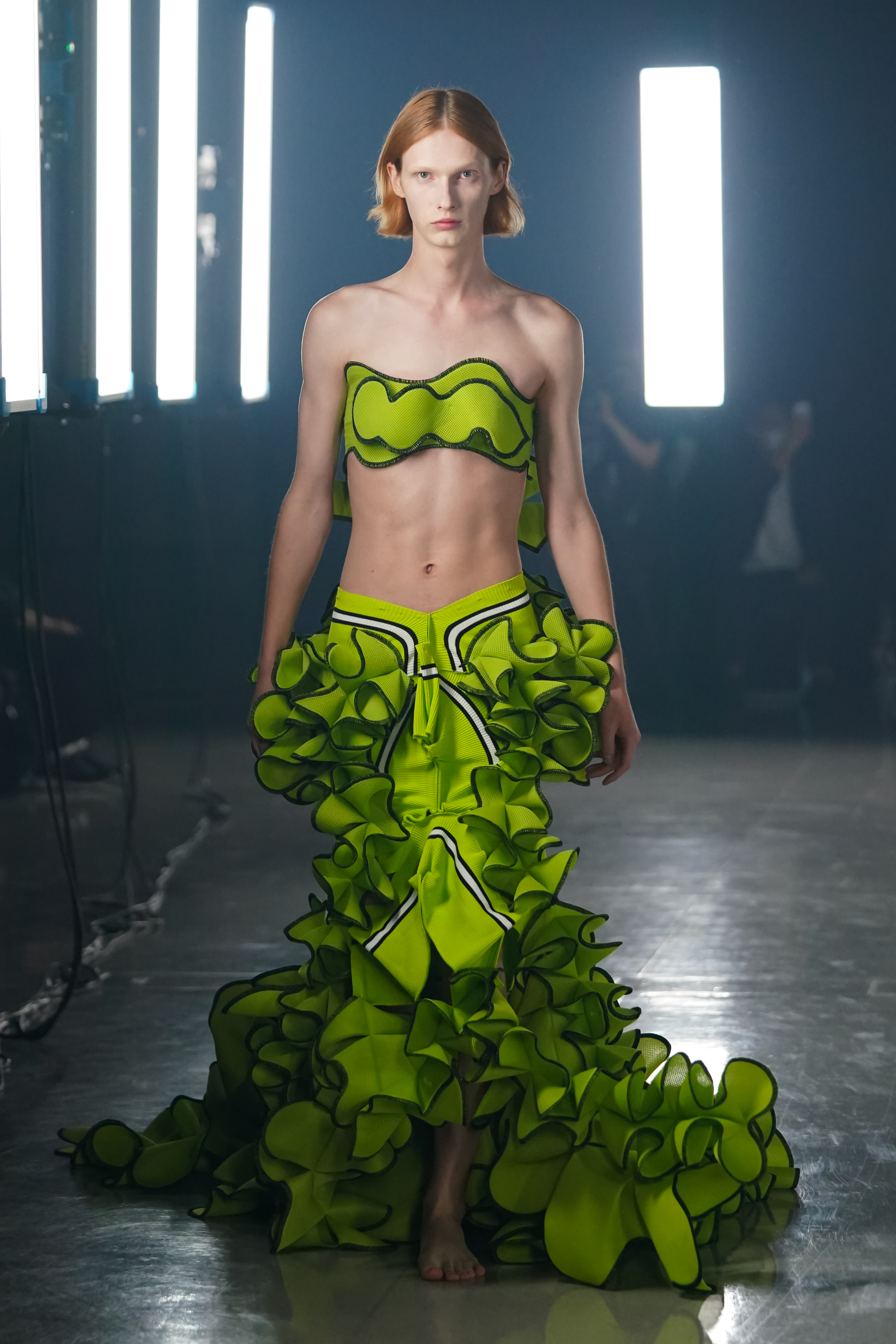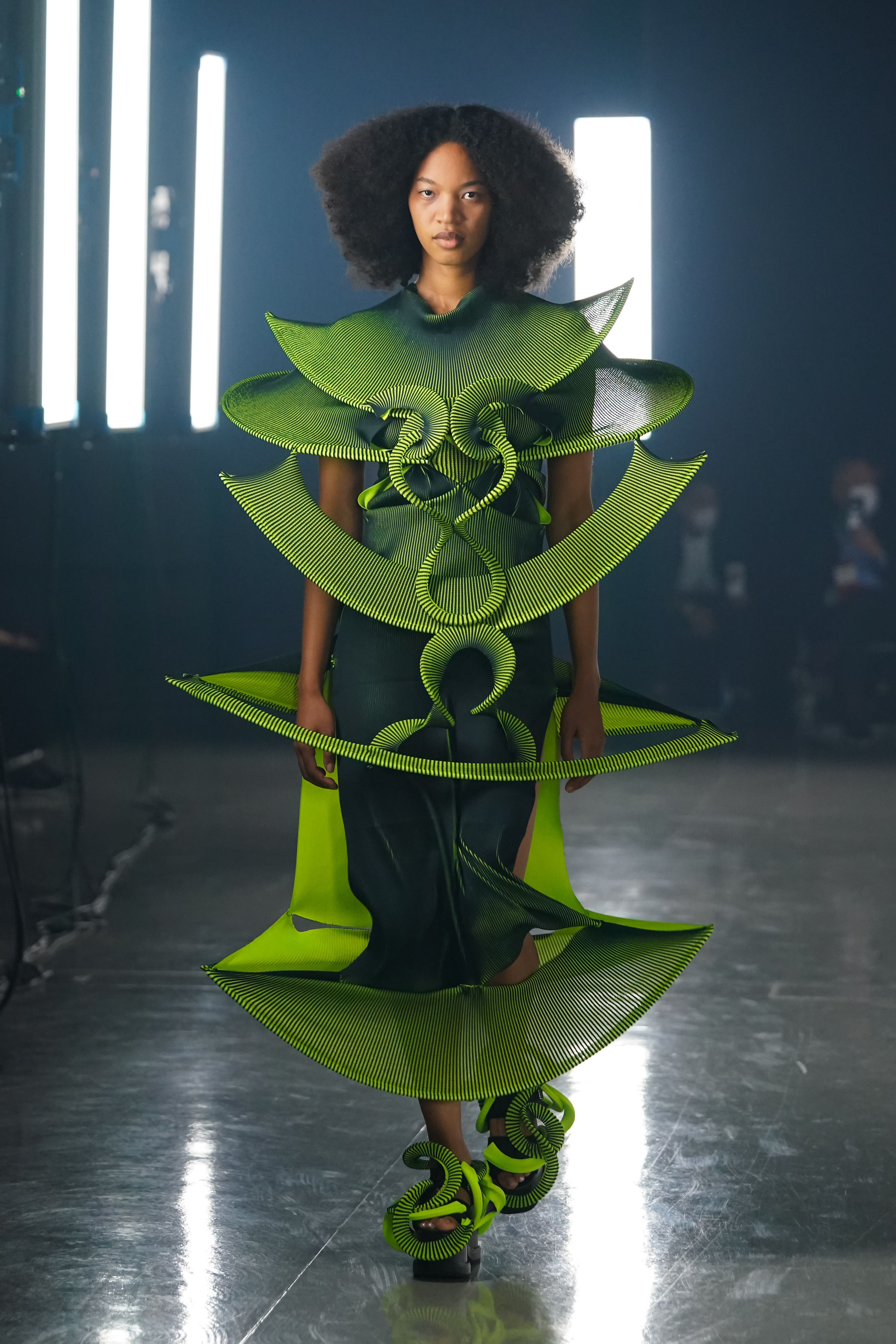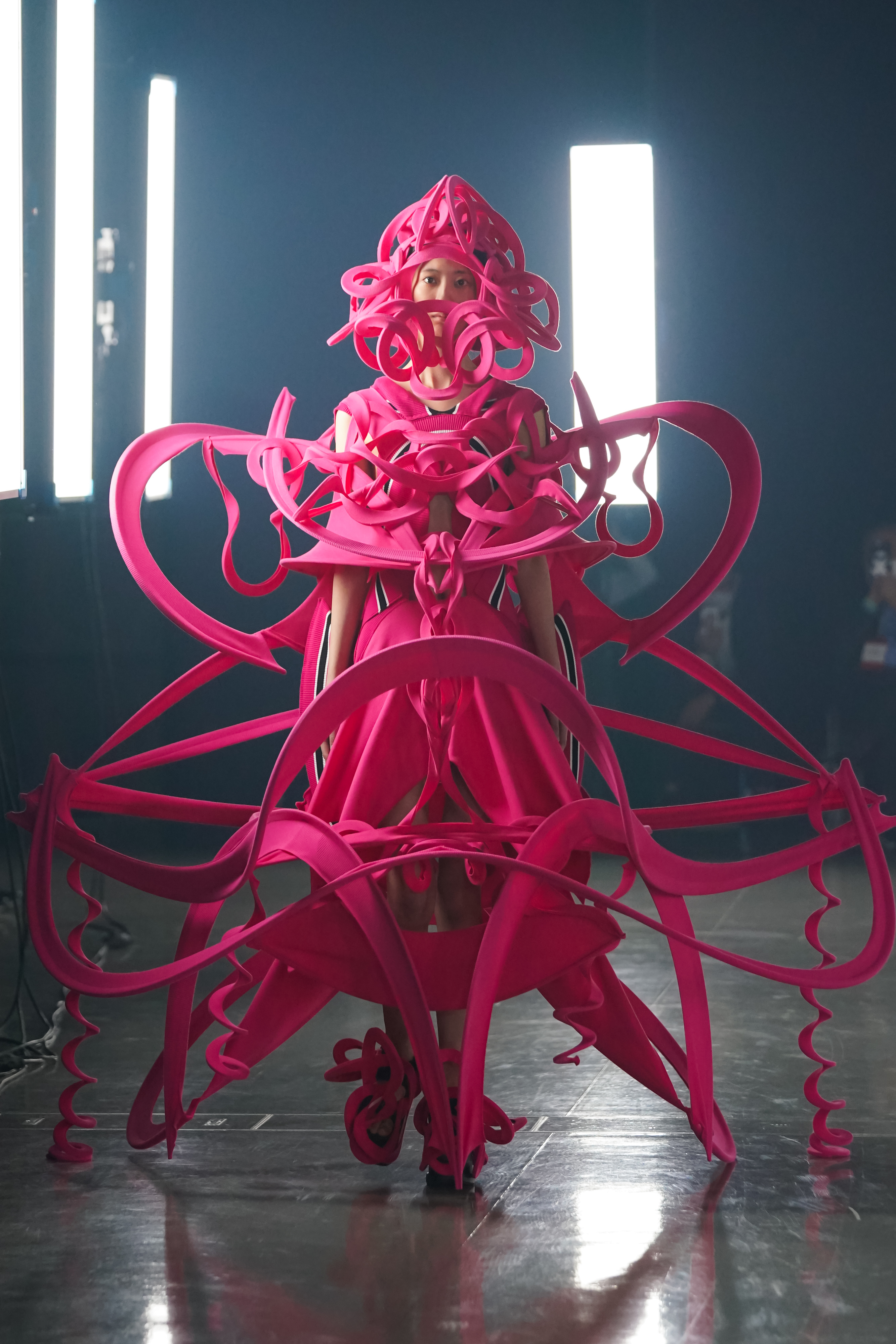 But the forms in fact correspond to an archaic lineage, informed by the religious ornamentation of Jomon-era Japan (a prehistoric period between 4,000 and 300 BCE) and the chromatics of Shintoist symbolism. As his hallucinatory garments have gathered international attention, the Tokyo Fashion Week newcomer stole the limelight in his 2022 Spring Ready-to-Wear collection with its boundless movement erupting from material.