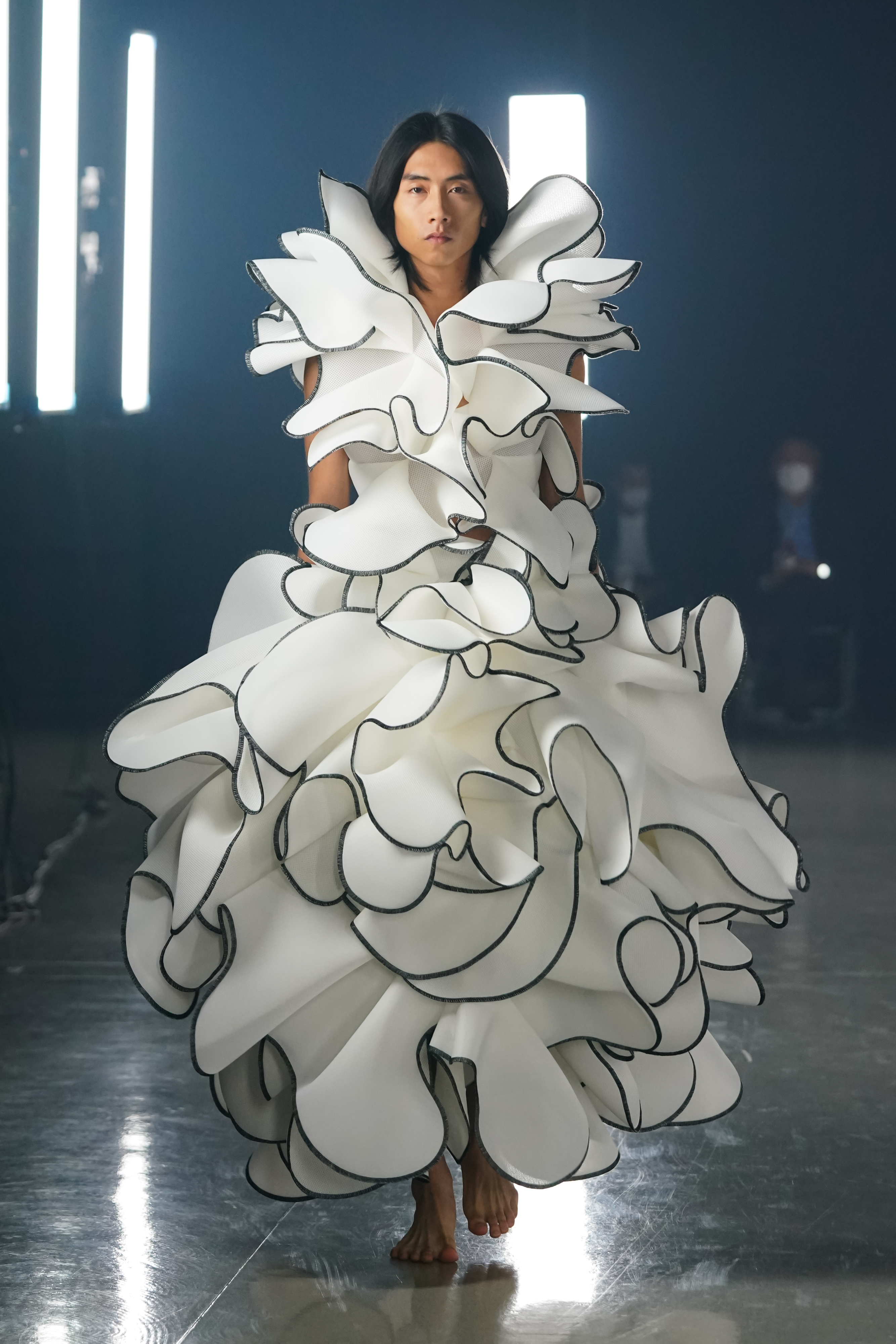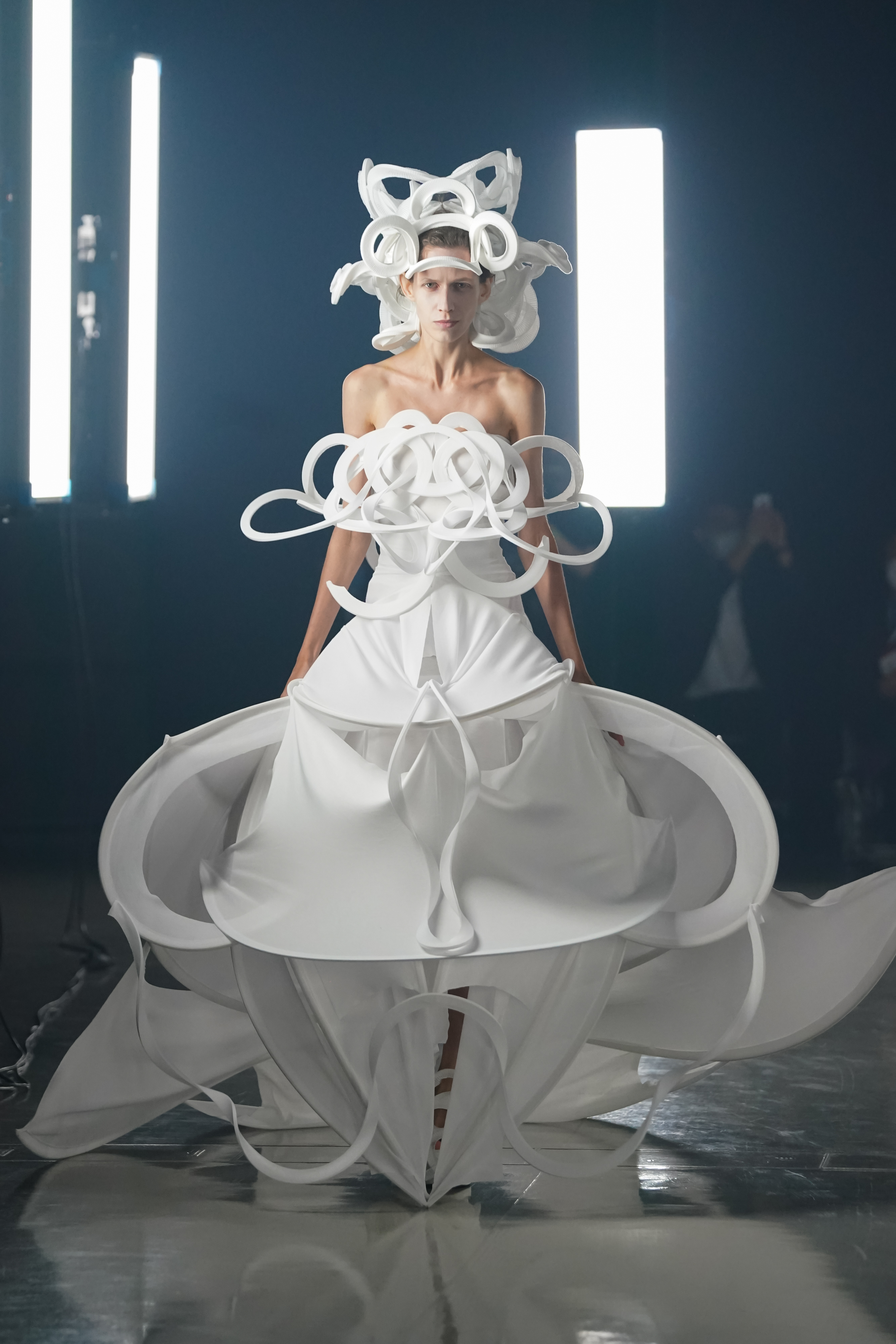 As much as his visions progress towards the future, a Hiroshima-native, Ryunosuke Okazaki imbues his couture with the spirit of collective memory. In the afterlife of historical catastrophe, their shapes ruminate on the psychic distortions brought about by modernity and redeem the severed coexistence of nature and culture. To BLANK magazine he explains, ‘Hiroshima, my hometown, suffered in the atomic bombings, losing its people and nature. Hundreds of paper cranes with prayers across the world have been sent to Hiroshima with the hopes of not repeating the same incident. The prayers elicit the intimacy between people and nature, the objects of worship.’ Sleek but poetic, his garments could be seen as a living philosophy—while their flares delve into the unconscious, the relationships between the human or the artificial, with the unfathomability of nature staged within an otherworldly geometry.