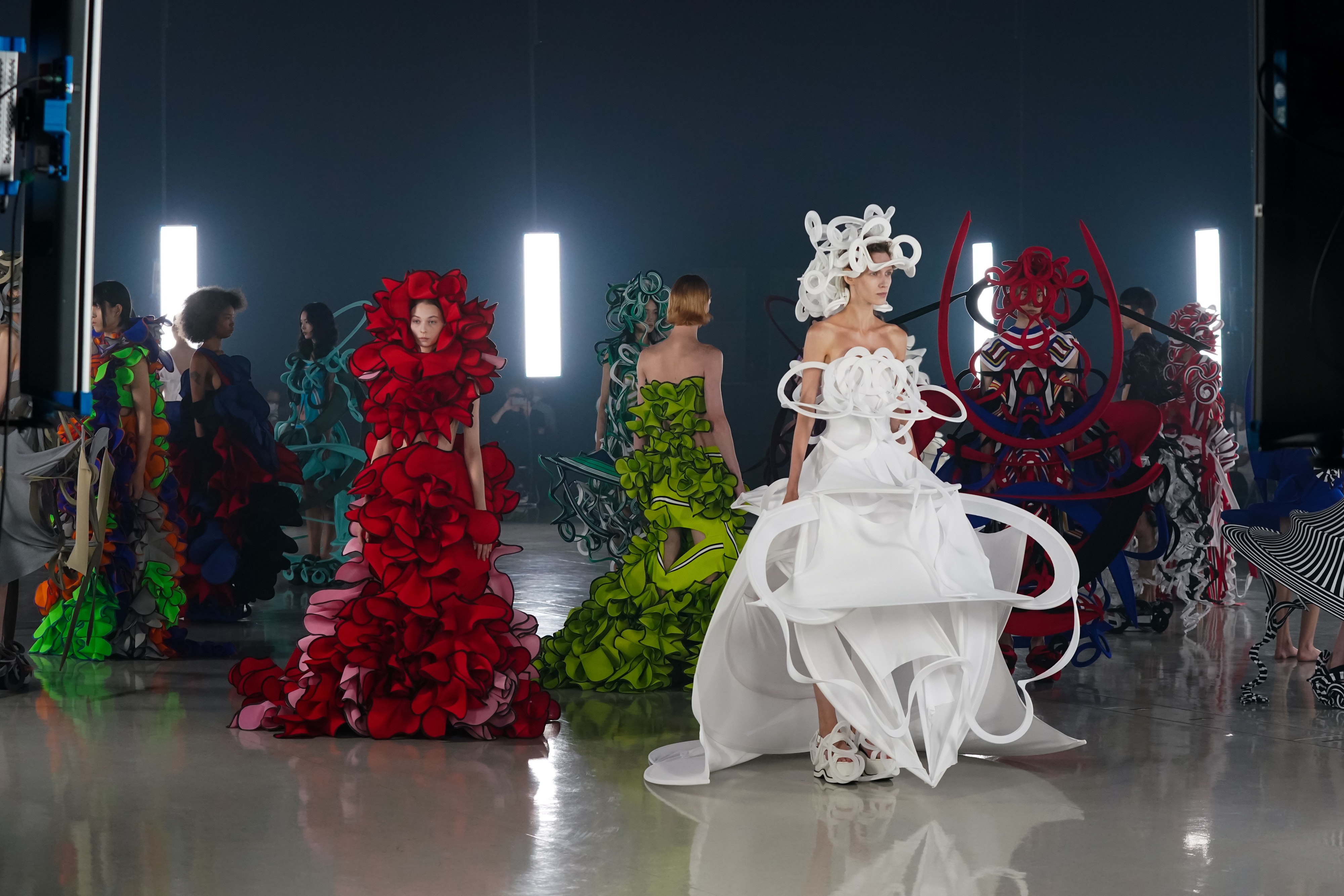At first glance, designer Ryunosuke Okazaki’s runways suggest distant futures. His models are ornate in lustrous, surrealist silhouettes, and his dresses are technically impressive, expressing a forward-thinkingness in daring sculptural swirls.