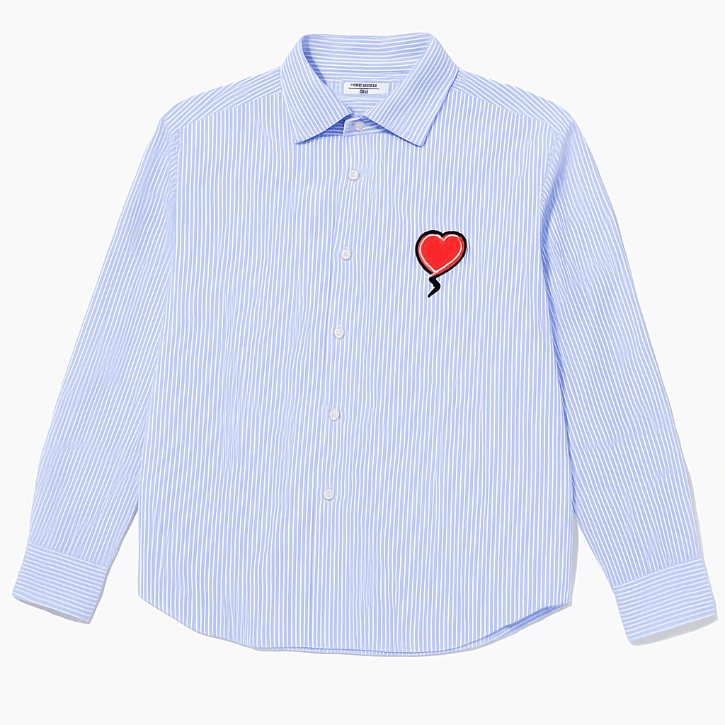 ‘A Heart Woven Between Tokyo and Paris’ shirt, created in collaboration with M/M PARIS for Isetan. Made from striped Oxford fabric with a heart patch on the chest, ¥36,300.