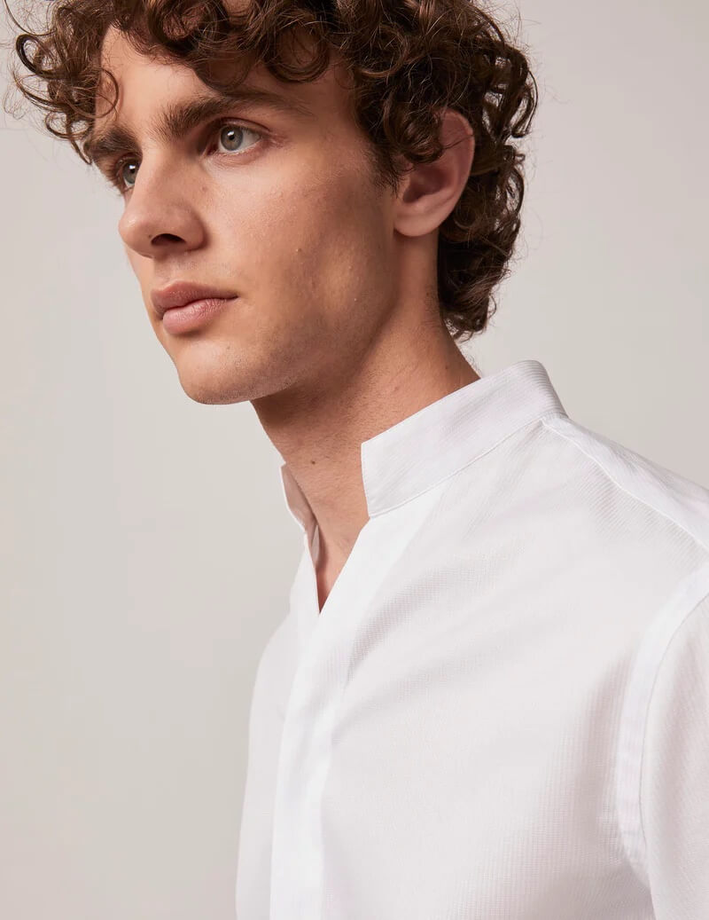 White ‘Carl’ dobby shirt with a hidden button placket and an open, straight collar, $230.