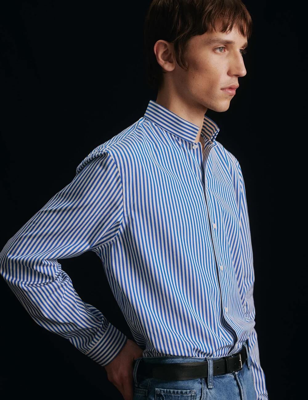 Semi-fitted blue striped poplin shirt with an inverted collar, $245.