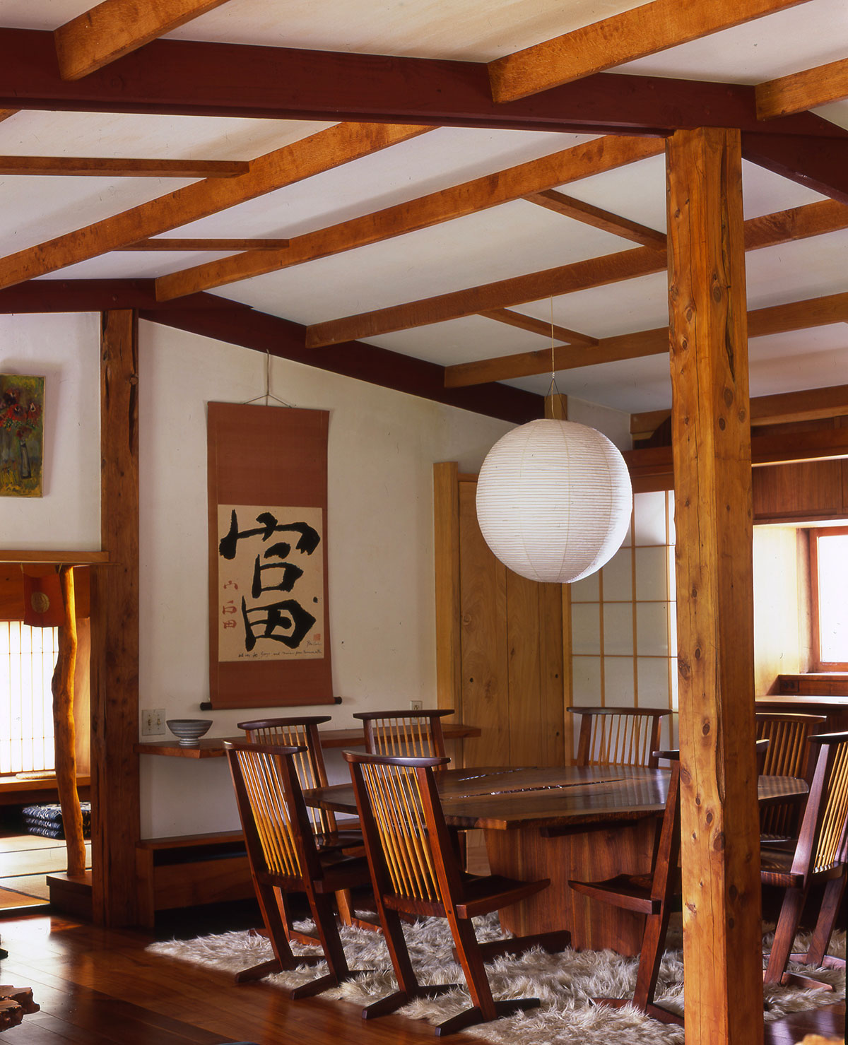 The buildings reflect the architect’s multiple influences. He was inspired by the international style, a movement that combines the teachings of the Bauhaus from Germany with the technical nature of the use of glass, steel, and concrete specific to the United States. George Nakashima was also strongly marked by traditional Japanese architecture, which uses natural materials in a more raw form. The 21 buildings that make up the Nakashima estate are therefore made from wood, local stone, or white stucco. The interior is flooded with light thanks to the ribbon windows and large glass walls.