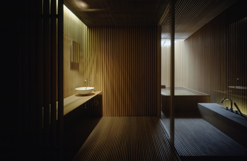 Lastly, the architect also worked with one of his key components, wood, particularly in order to create partitions with multiple wooden slats to demarcate the rooms dedicated to bathing. Installed in such a way as to let light from outside pass through but without offering a bird’s-eye view over those relaxing in the onsen, these walls conform to the strategy adopted by Kengo Kuma for renovating Ginzan Onsen Fujiya: prioritising use of natural (and local, the wood being the same as that used when the hotel was built) materials rather than others, like concrete, that were used when the hotel was previously renovated in 1913.