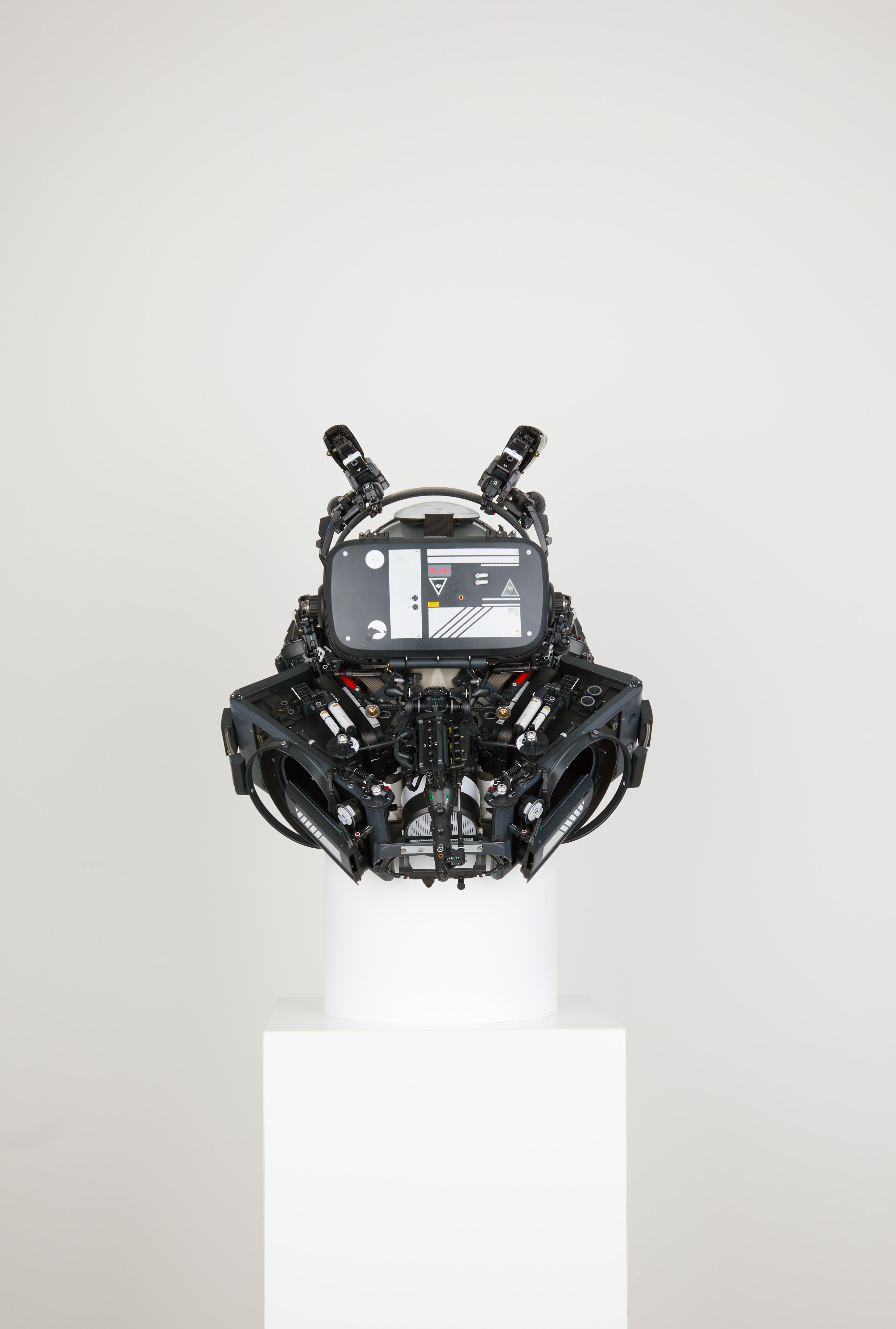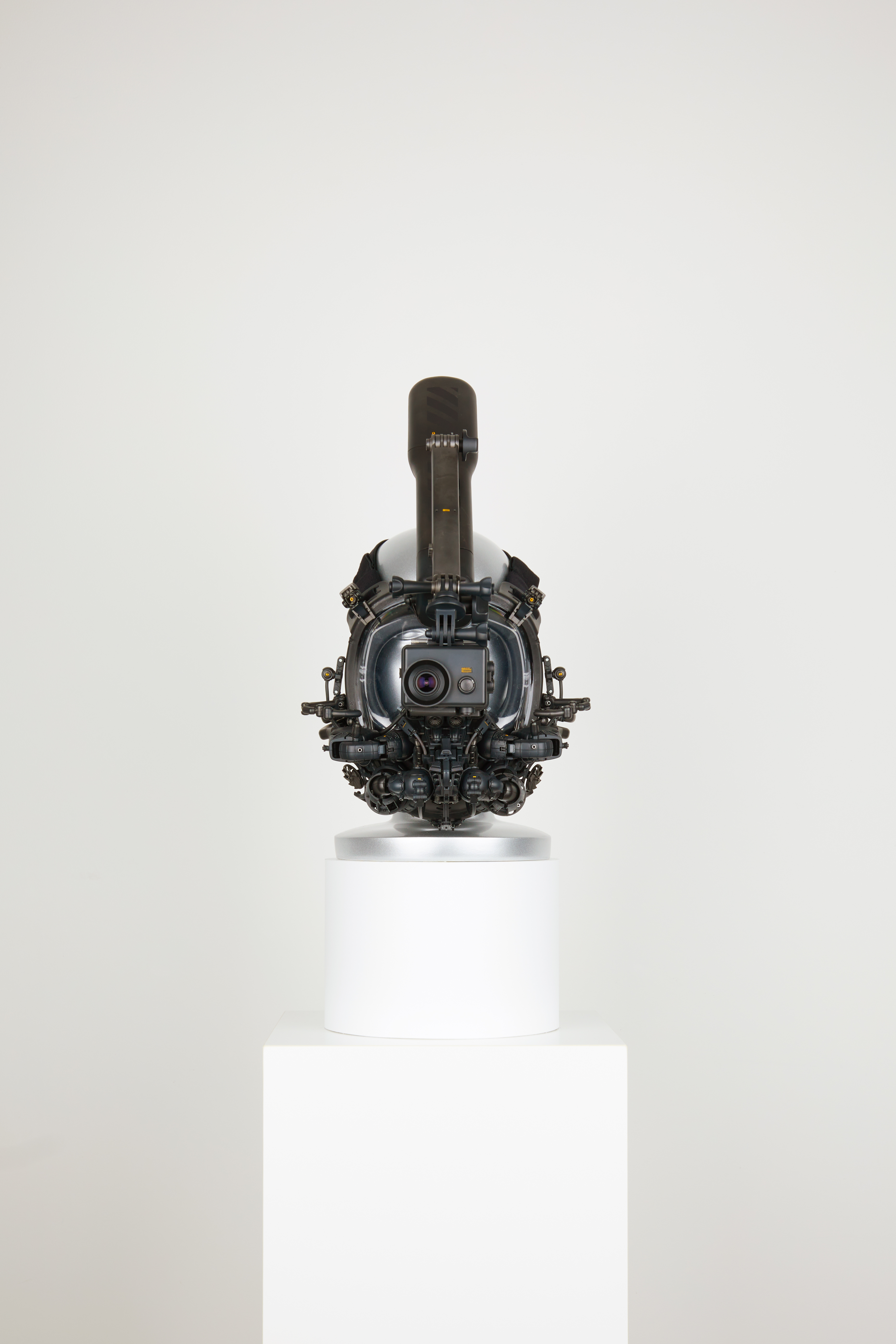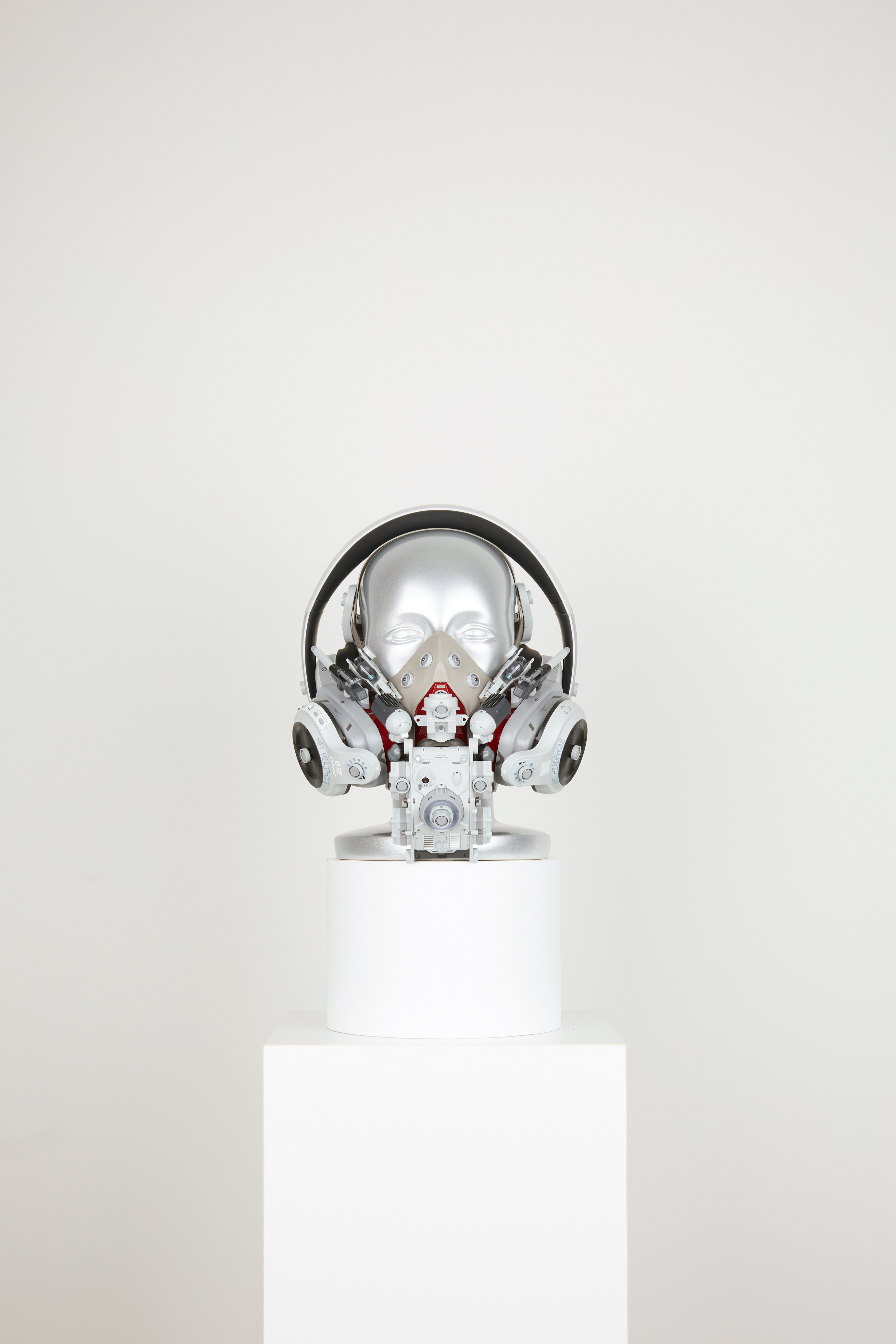 Aside from their striking visuality, each of his models, assembled by the parts of gadgets such as phones, computers and virtual reality gear, conceal real functions—his sculptures can be used, worn and experienced from an intrinsic perspective. While the intricacy of his works project an elaborate high-tech futurism, their designs appealingly suggest nostalgic 80s pop-culture references and a Japanese childhood immersed in science-fiction.