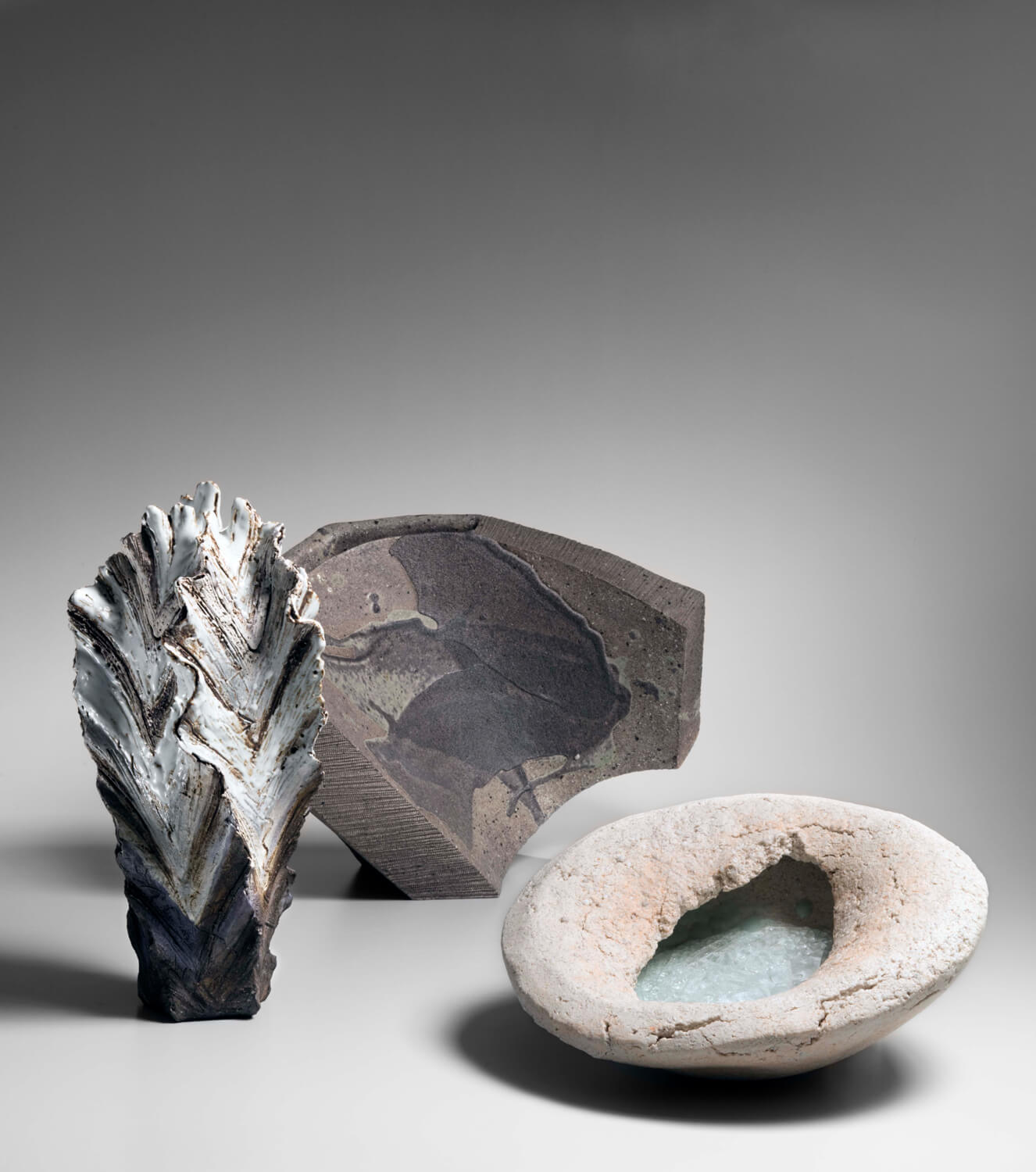From left: Koike Shoko, 2002, On loan from a Private Collection, USA; Hoshino Kayoko, Cut Out 16 – 12, 2016, On loan from Joan B Mirviss LTD; Ogawa Machiko, Heki-yuu ban; Blue-green/clear glazed vessel, 2008, On loan from Joan B Mirviss LTD