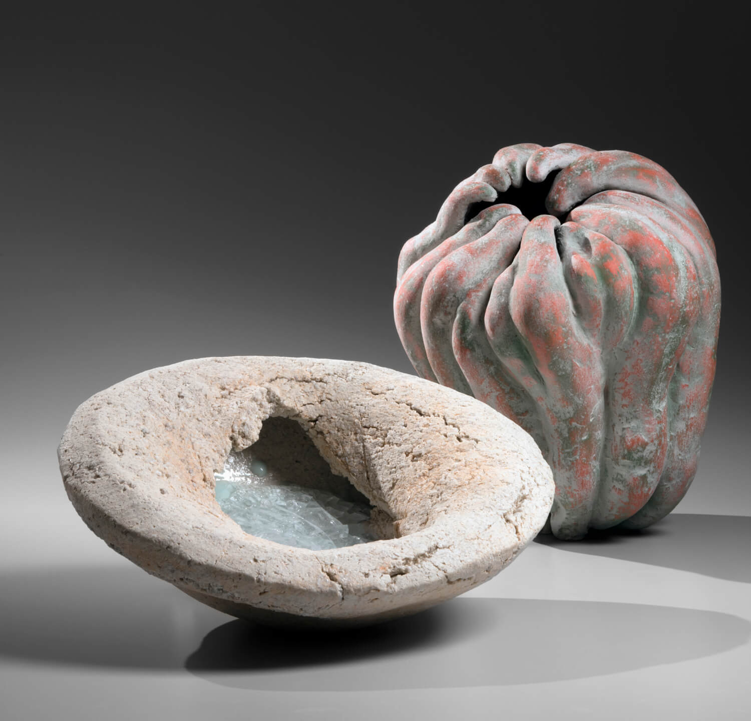 Left: Ogawa Machiko, Heki-yuu ban; Blue-green/clear glazed vessel, 2008; Right: Katsumata Chieko, Akoda: Pumpkin, 2016, Both on loan from the Diana Reitberger Collection