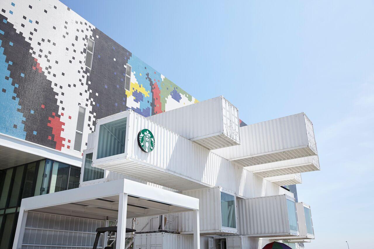 While the café is owned by Starbucks (who own over 40 similar cafés/containers like this, mainly in the United States), the company’s branding is unusually nowhere to be seen. From the outside, only the emblematic green logo with its mermaid gives it away.