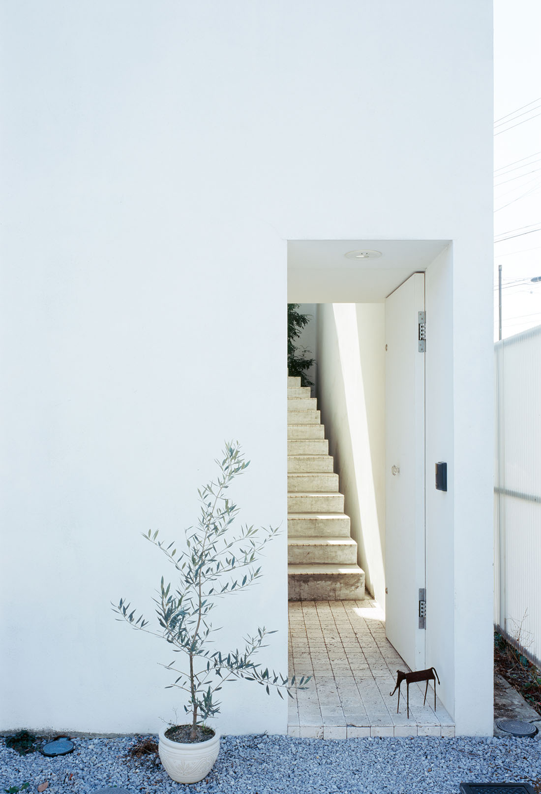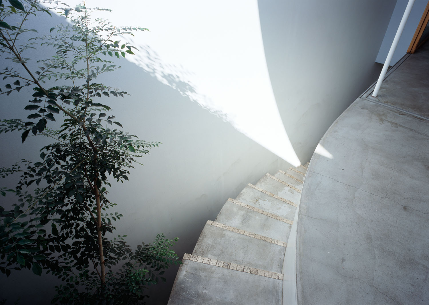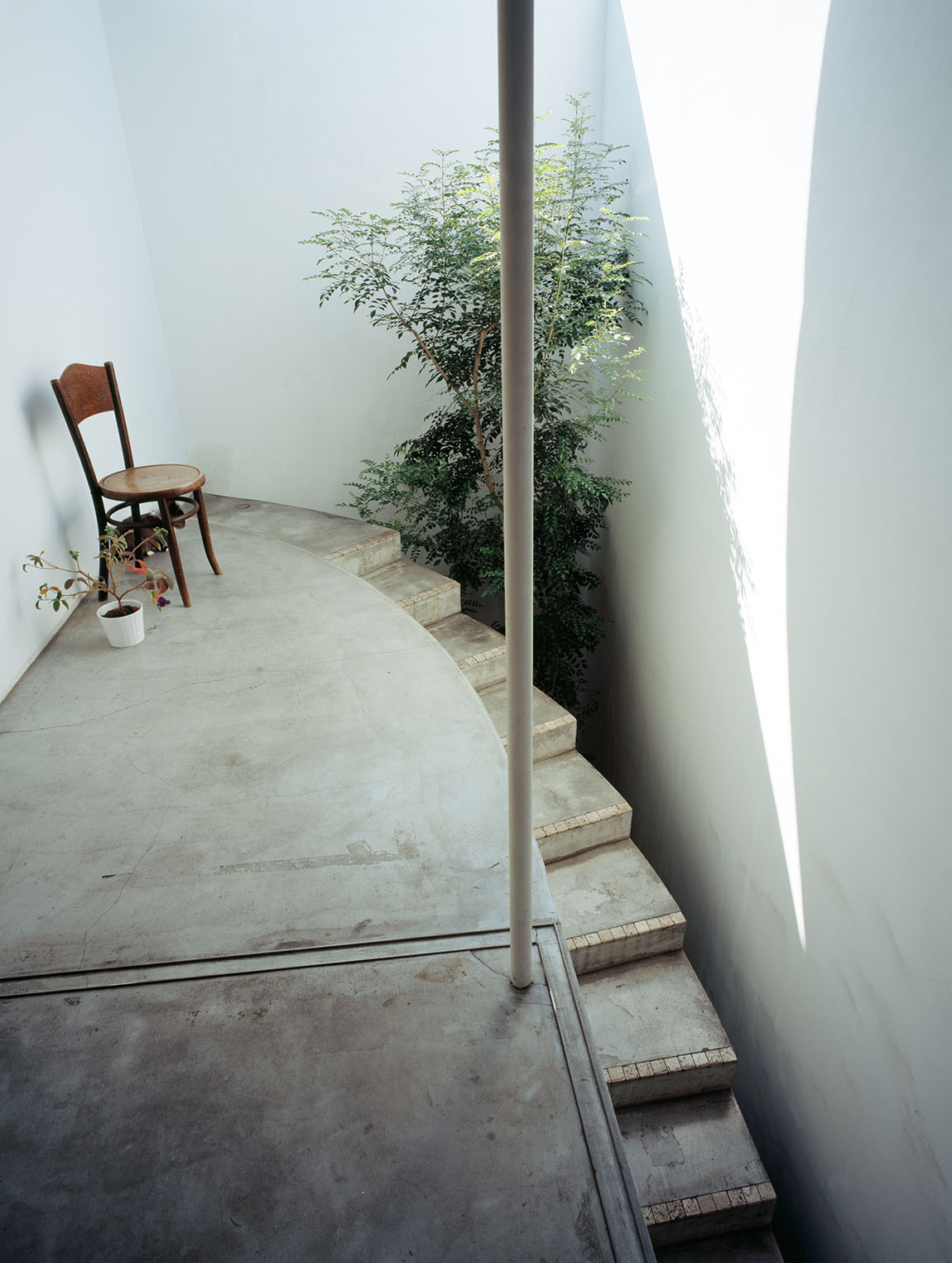 The ground floor, protected by a wooden staircase moulded in concrete, comprises the bathroom and a bedroom, while the kitchen and dining room are found upstairs, extending outside onto a terrace. The space is described on their website by architect Takeshi Hosaka as ‘neither inside nor outside, where the sun and rain of Yokohama can easily enter.’