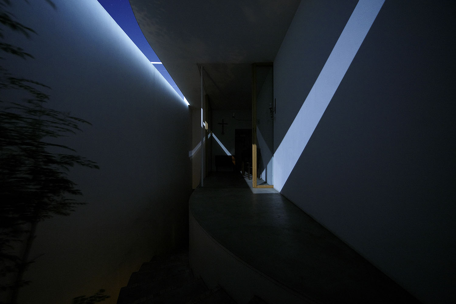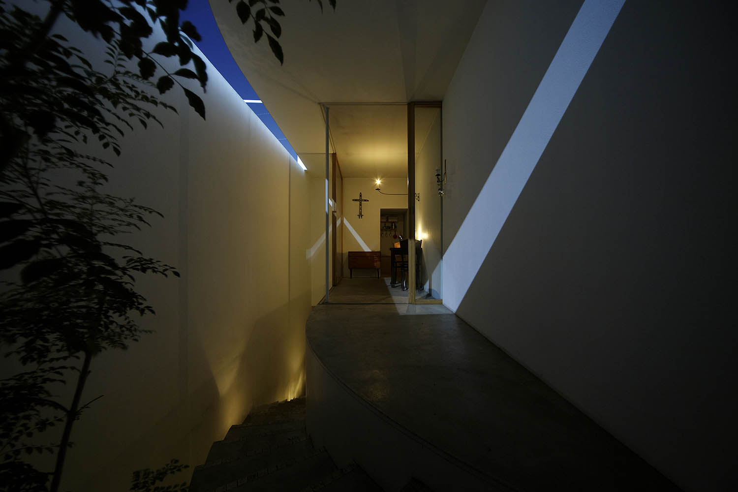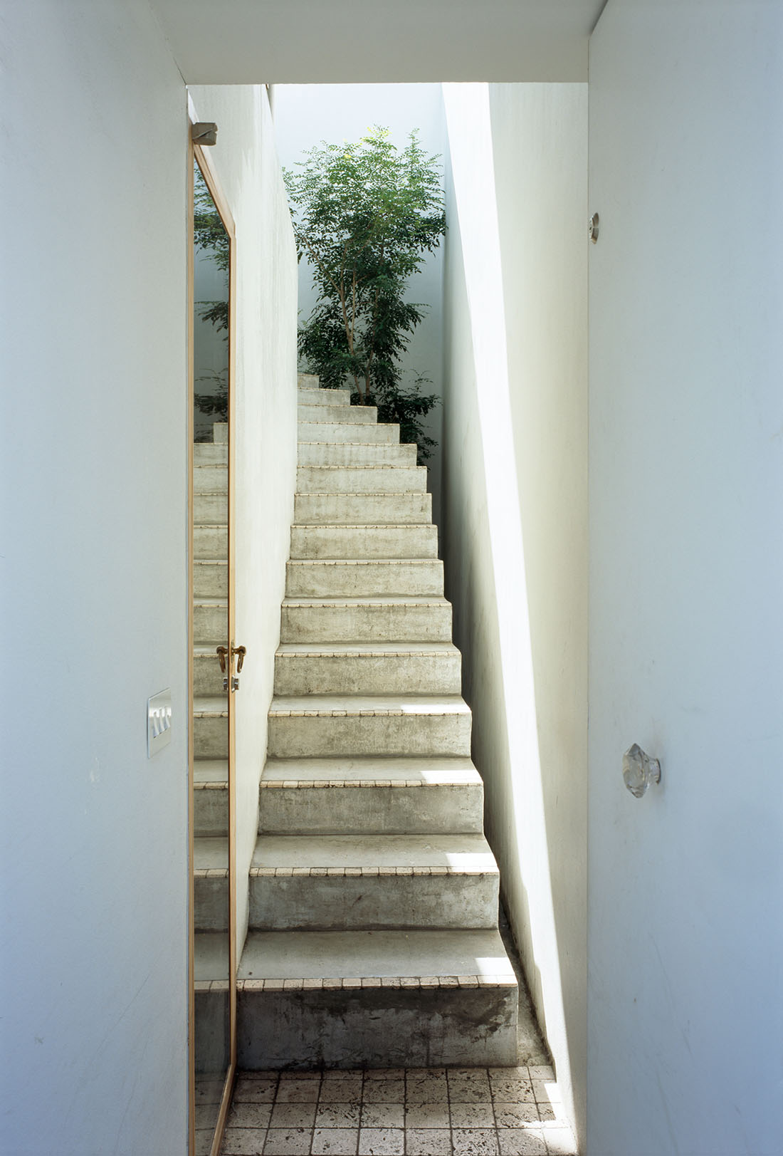 The ground floor, protected by a wooden staircase moulded in concrete, comprises the bathroom and a bedroom, while the kitchen and dining room are found upstairs, extending outside onto a terrace. The space is described on their website by architect Takeshi Hosaka as ‘neither inside nor outside, where the sun and rain of Yokohama can easily enter.’