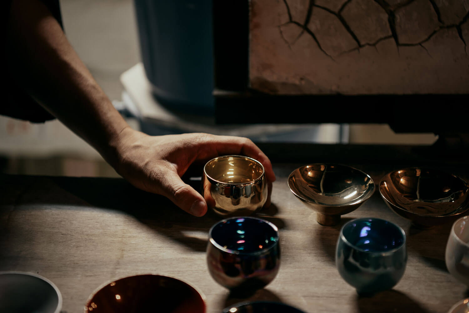 ‘Which cup would you like?’ In an izakaya or Japanese bar, one is rarely presented with a box containing various cups and invited to choose one. However, the ability to select a preferred size and shape, as well as the sensations acquired by touching the sakazuki are both involved in enjoying sake, just like carefully chosen nihonshu and its temperature. In addition to being used to drink the sake, sakazuki are, like the bowls used in the tea ceremony, vessels representing the personality of the individual, and they add a unique dimension to the time spent tasting. However, one simply cannot speak of sakazuki that enables the full nihonshu experience without also mentioning acclaimed potter Ryota Aoki. From traditional pieces used in tea ceremonies to more modern pieces representing artistic scenes, this potter’s work draws pottery lovers and collectors from the world over. In recent years, Ryota has come into the public gaze by making wine glasses and champagne flutes with shapes that are considered all but impossible to recreate in pottery. We met up with him in the town of Toki, in the Gifu Prefecture southwest of Tokyo, to learn about the tableware the artist is making as companion pieces to nihonshu, as well as the intricacies of his manufacturing process.