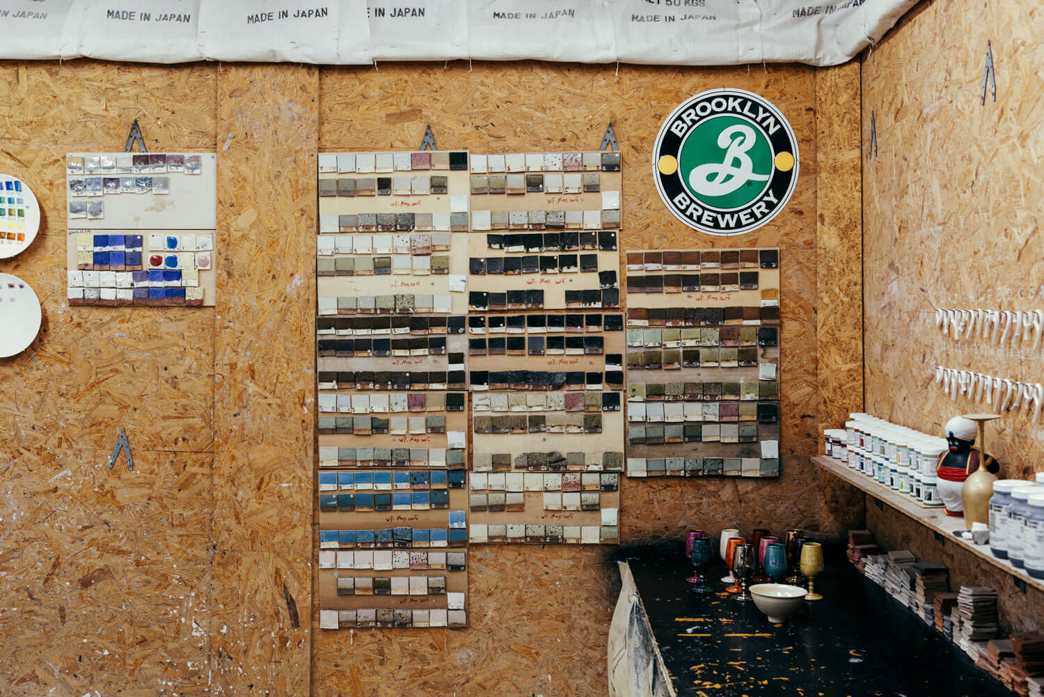 The walls are covered with test pieces on which the artist tries out different glazes.