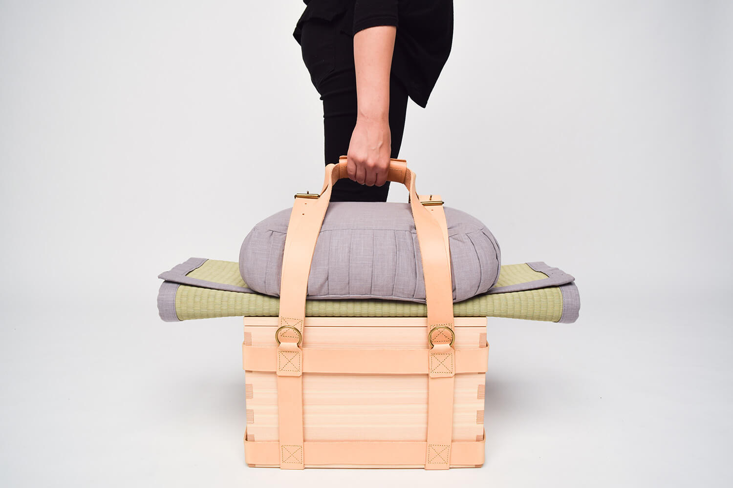 Made from Japanese cypress, the chest is inspired by Japanese boxes used by Buddhist monks, called Hakozen, where they would store their cooking utensils. The tatami mat is made from igusa and woven in a traditional way. Its initial colour, a greenish shade, changes over time to a soft yellow, releasing a subtle yet delicious scent of dried grass.