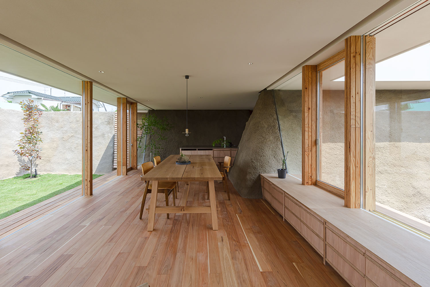To strengthen this sense of being connected to nature, Soil House has large bay windows that open onto the garden, and the floor and all the storage areas are made from wood from the region. ‘This house is designed according to the concept of balance between stasis and dynamism; stasis to reflect in silence and dynamism to get to work’, ADX explains. ‘We want this house to encourage people to think about themselves, their family, the region, and society in a comfortable and peaceful way.’