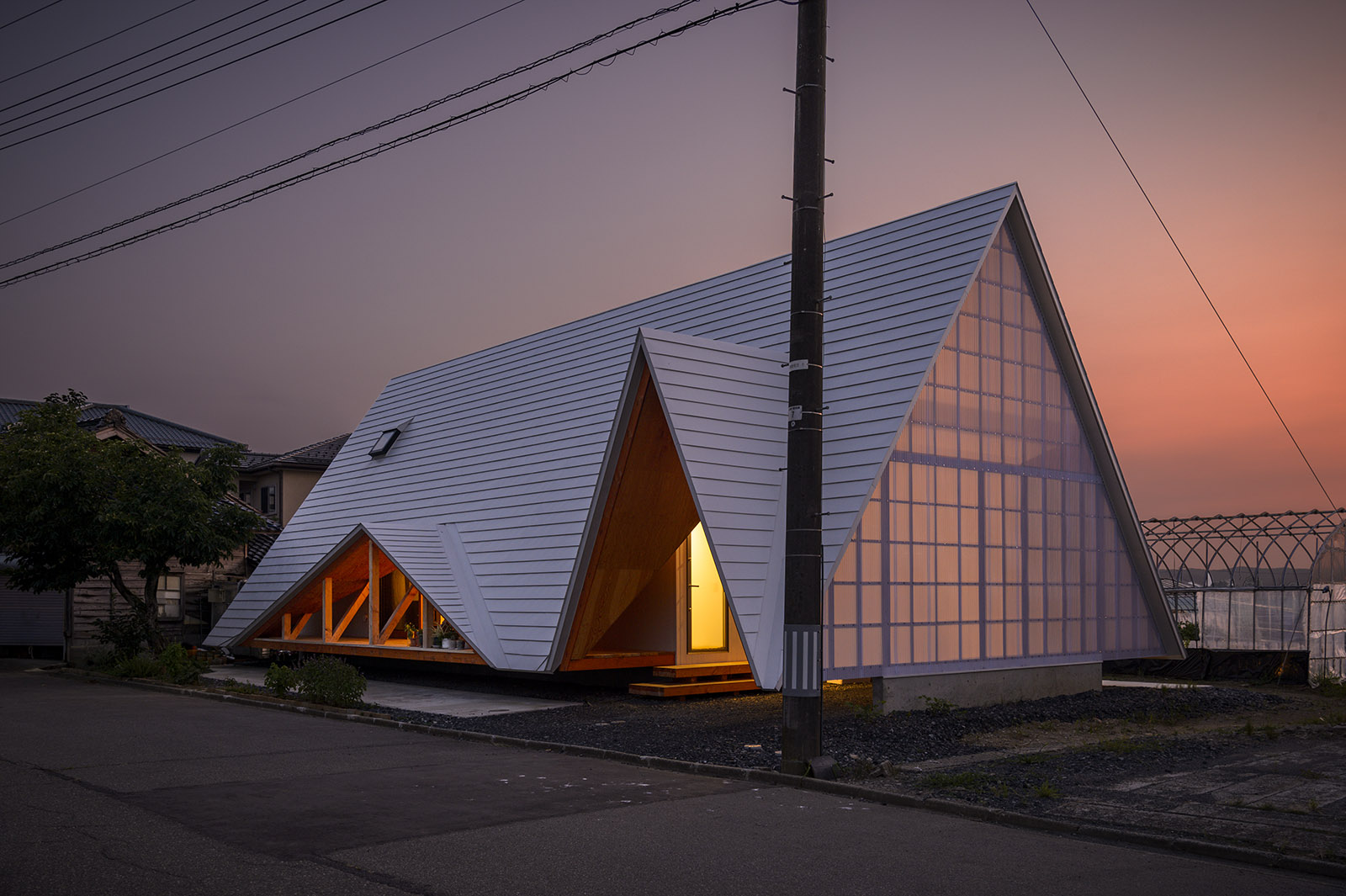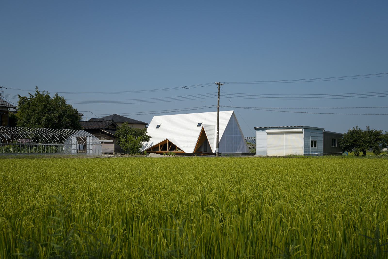 Hara House was designed by the Japanese architectural firm Takeru Shoji Architects, in the little rural village of Tsugurasone in Niigata prefecture. With its white roof, which seems stretched like a canvas that nearly reaches the ground, and its triangular shape, it forms a striking contrast with the traditional Japanese houses, ridges, and rice fields that surround it. The patrons designed the house to be a meeting point for the residents. ‘We created a space where passing neighbours, friends, and children can simply stop by.’