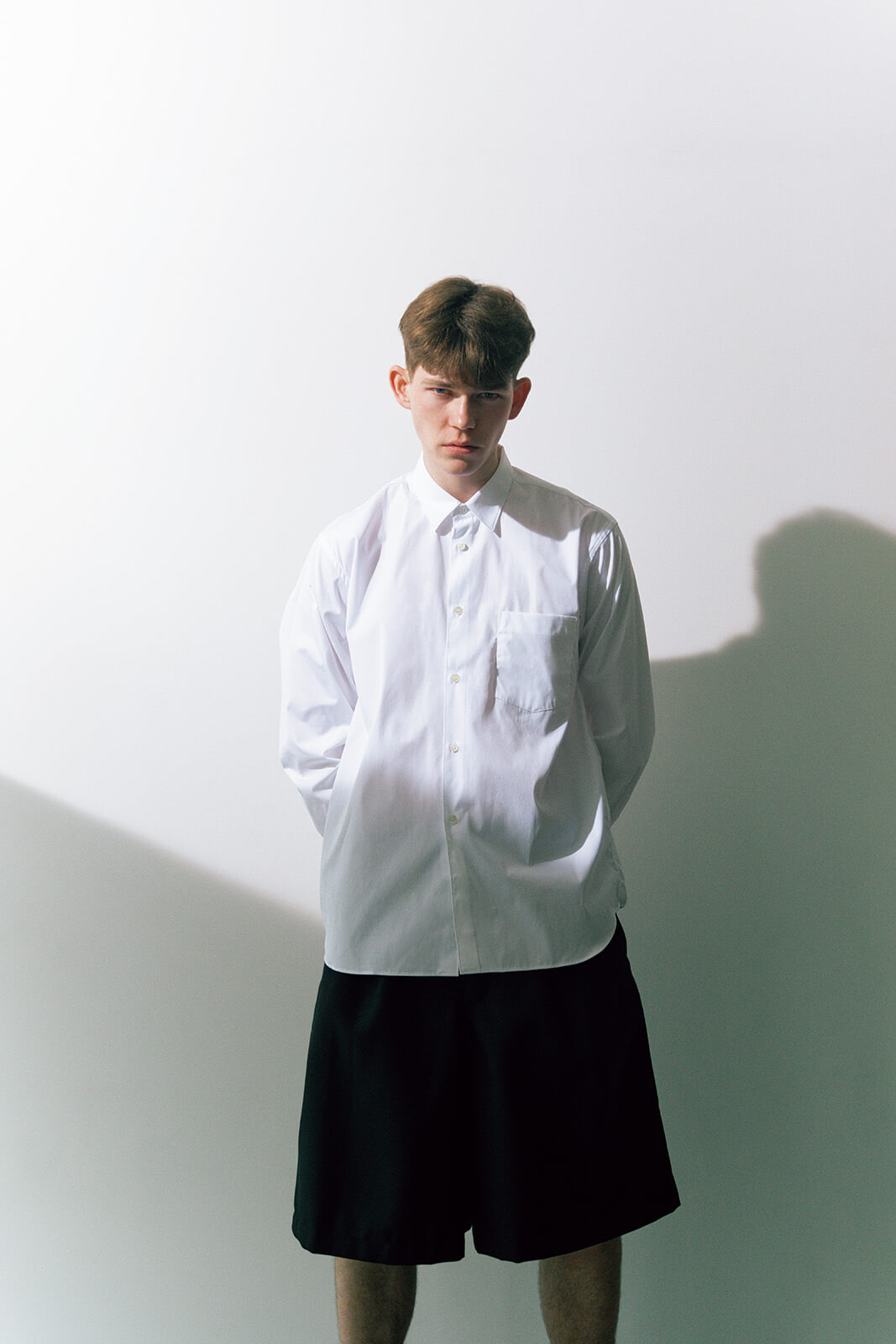 The white ‘Wide Classic’ shirt, worn with shorts—both by COMME des GARÇONS SHIRT (COMME des GARÇONS).