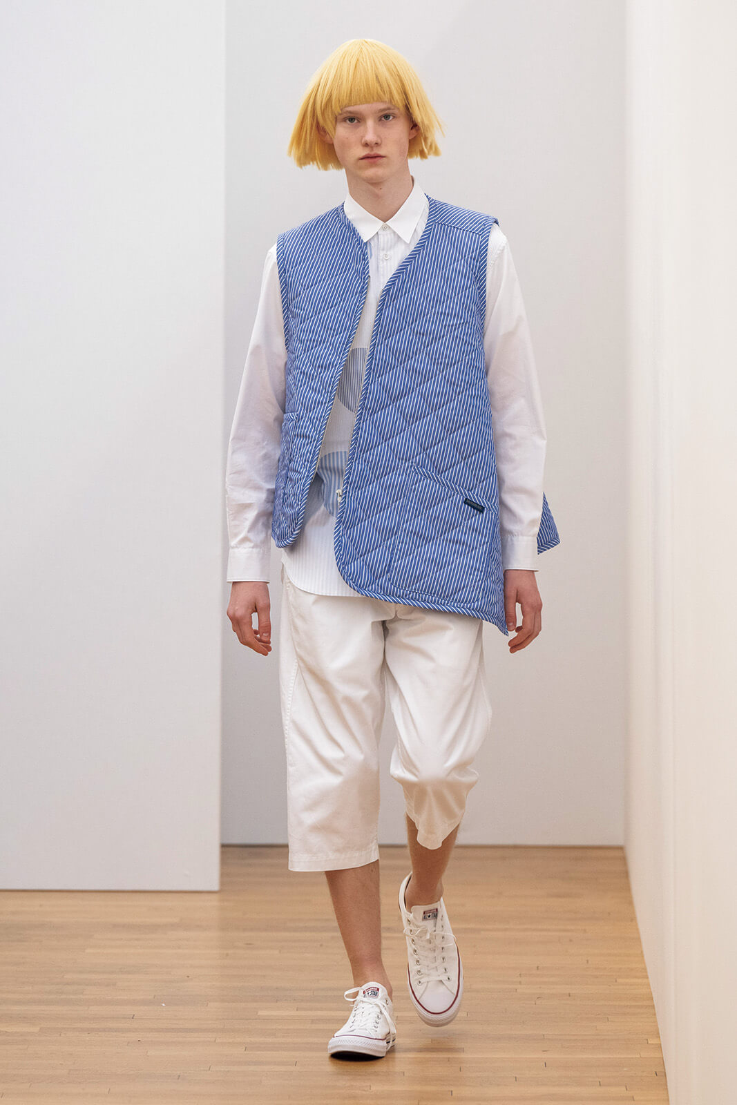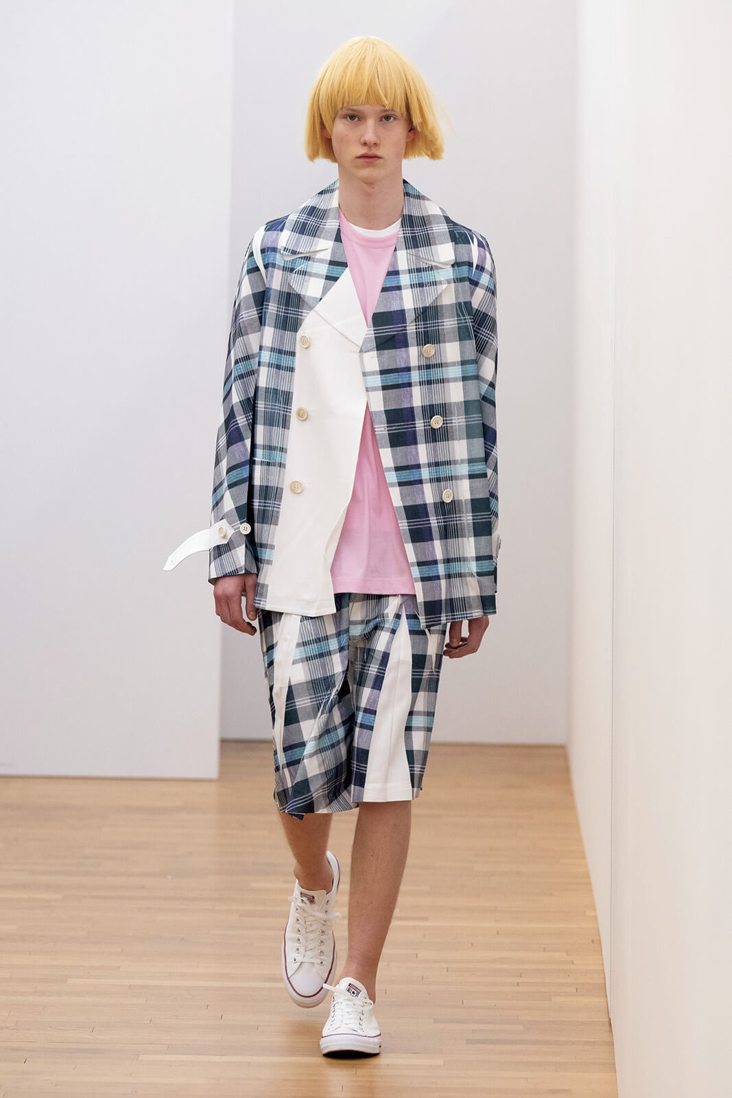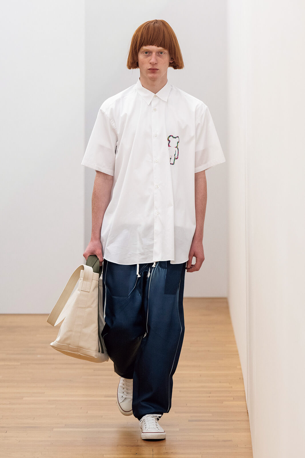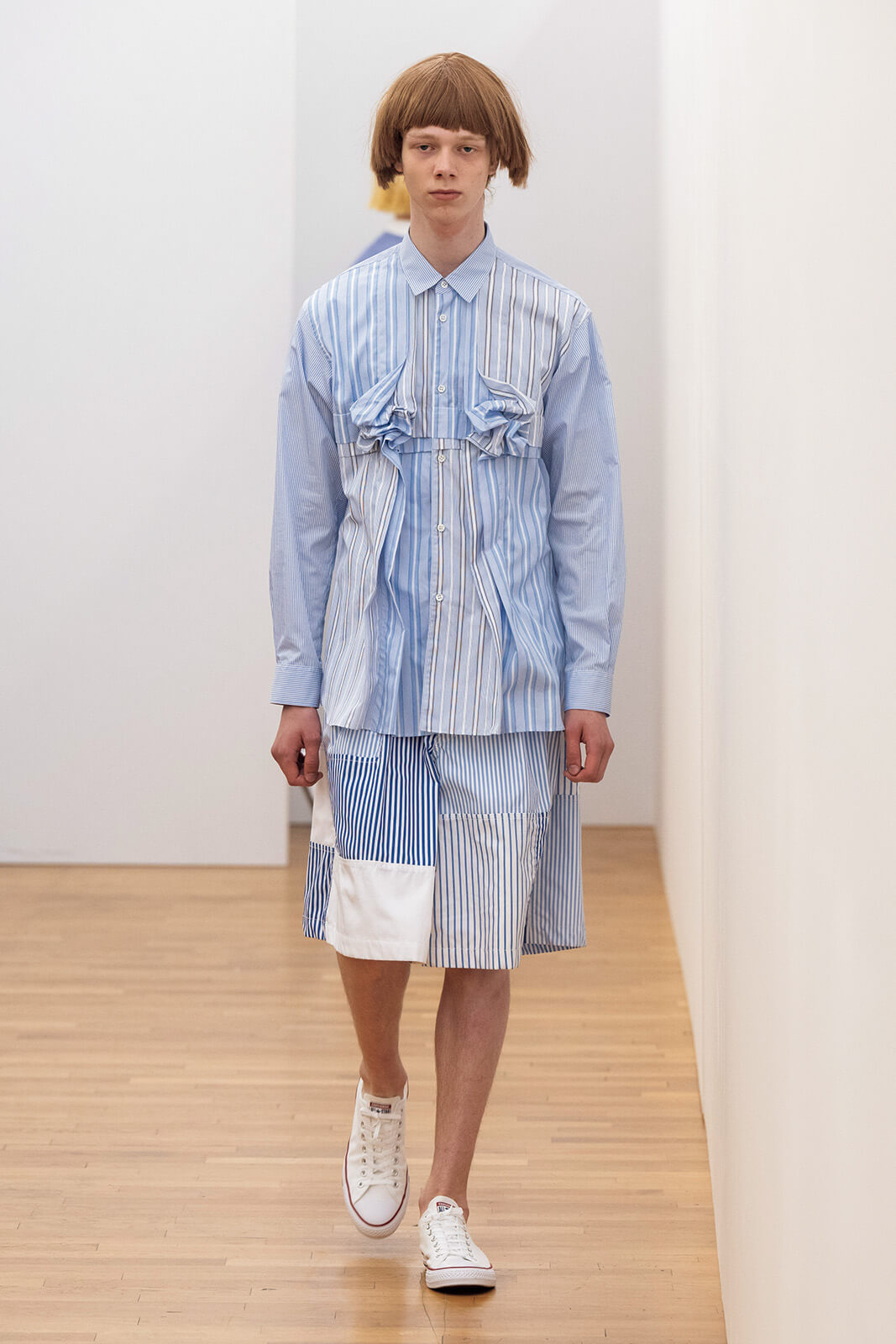 The COMME des GARÇONS SHIRT collection is presented in a Paris showroom during Fashion Week. On the opening look for the Spring/Summer season, the lapel and placket areas are left white, without any print.
