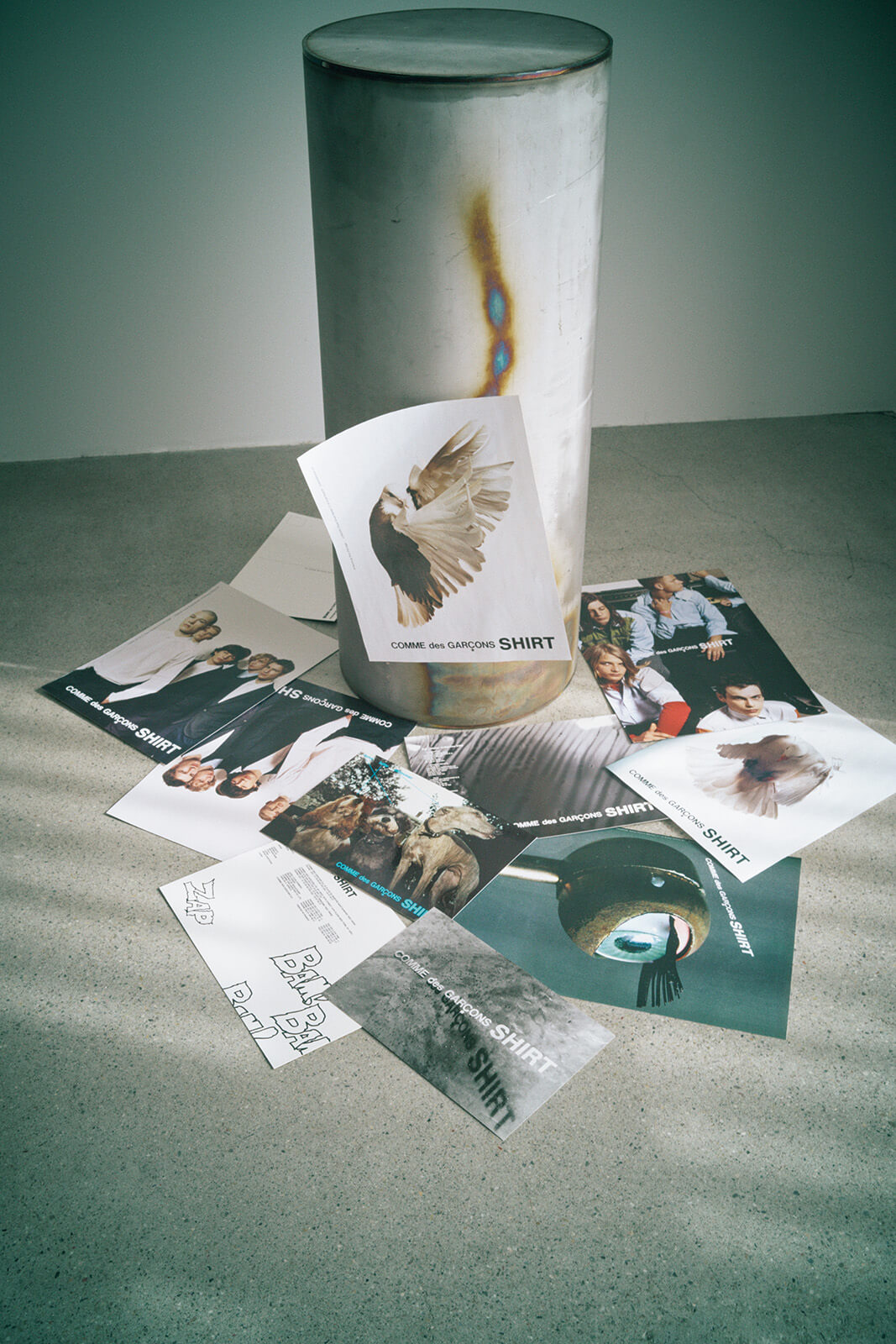 As a French company, the brand has always run its advertising not in Japan, but in European magazines. While some images feature models wearing shirts or jackets, many visuals present motifs unrelated to clothing, such as doves or various objects, all emblematic of the COMME des GARÇONS world. Graphics in the foreground or invitations featuring a dog were used to announce trade shows or the launch of new seasons. Stainless steel object: THEO by Fateindustries.