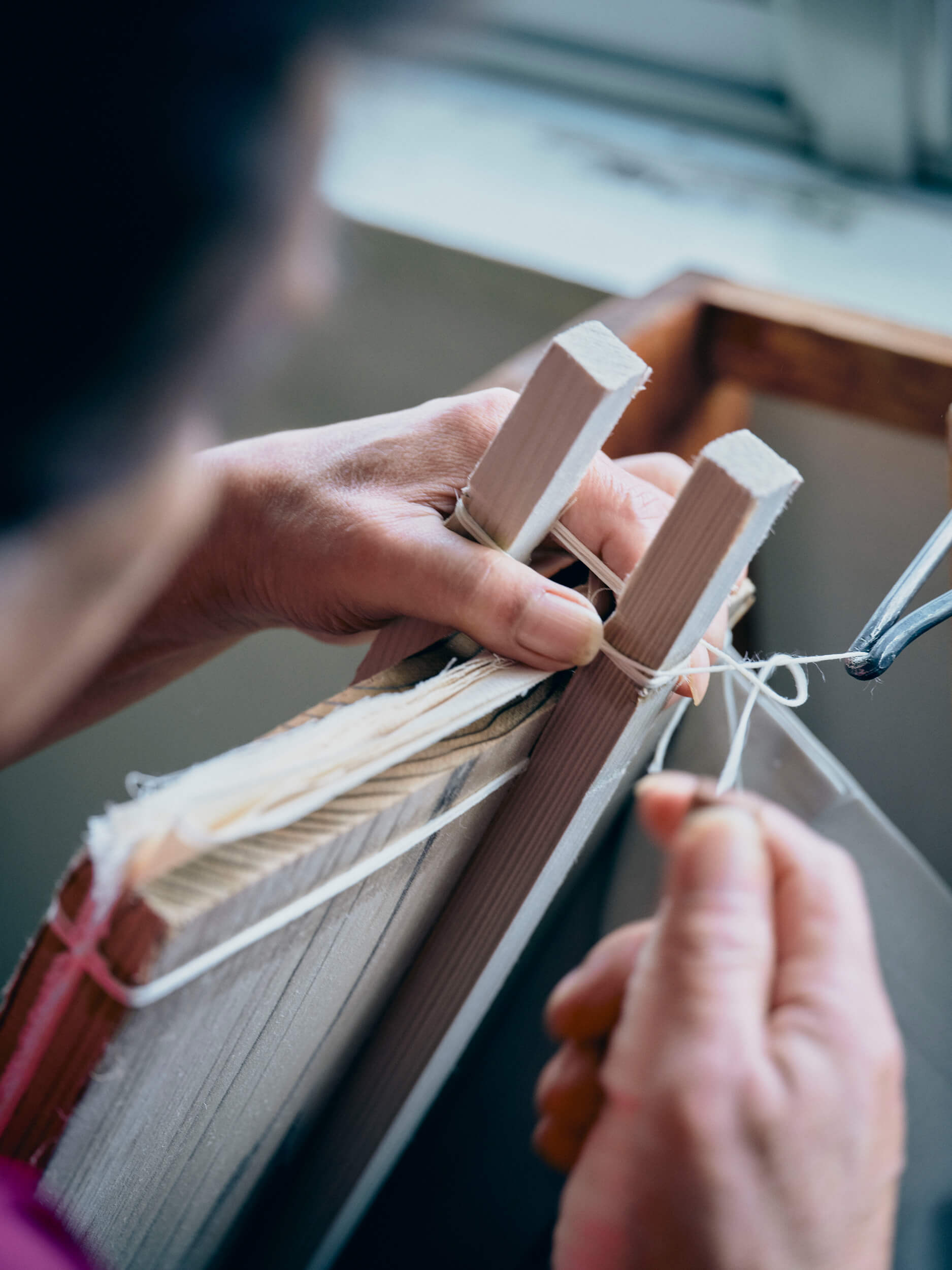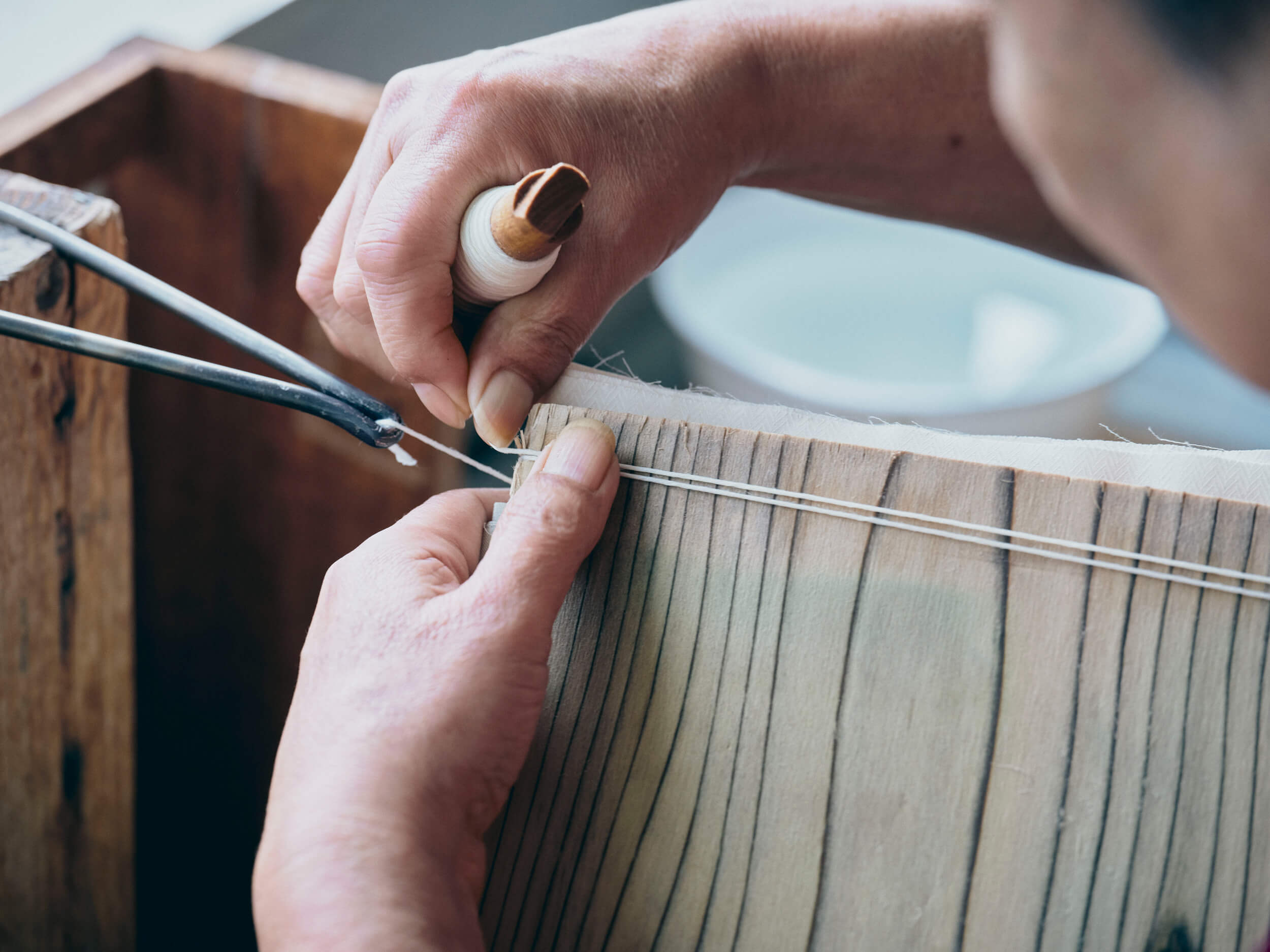 Thread is wound around a custom metal tool and hooked into place. The craftsman tightens the string with precision, creating the signature squeezing sound.