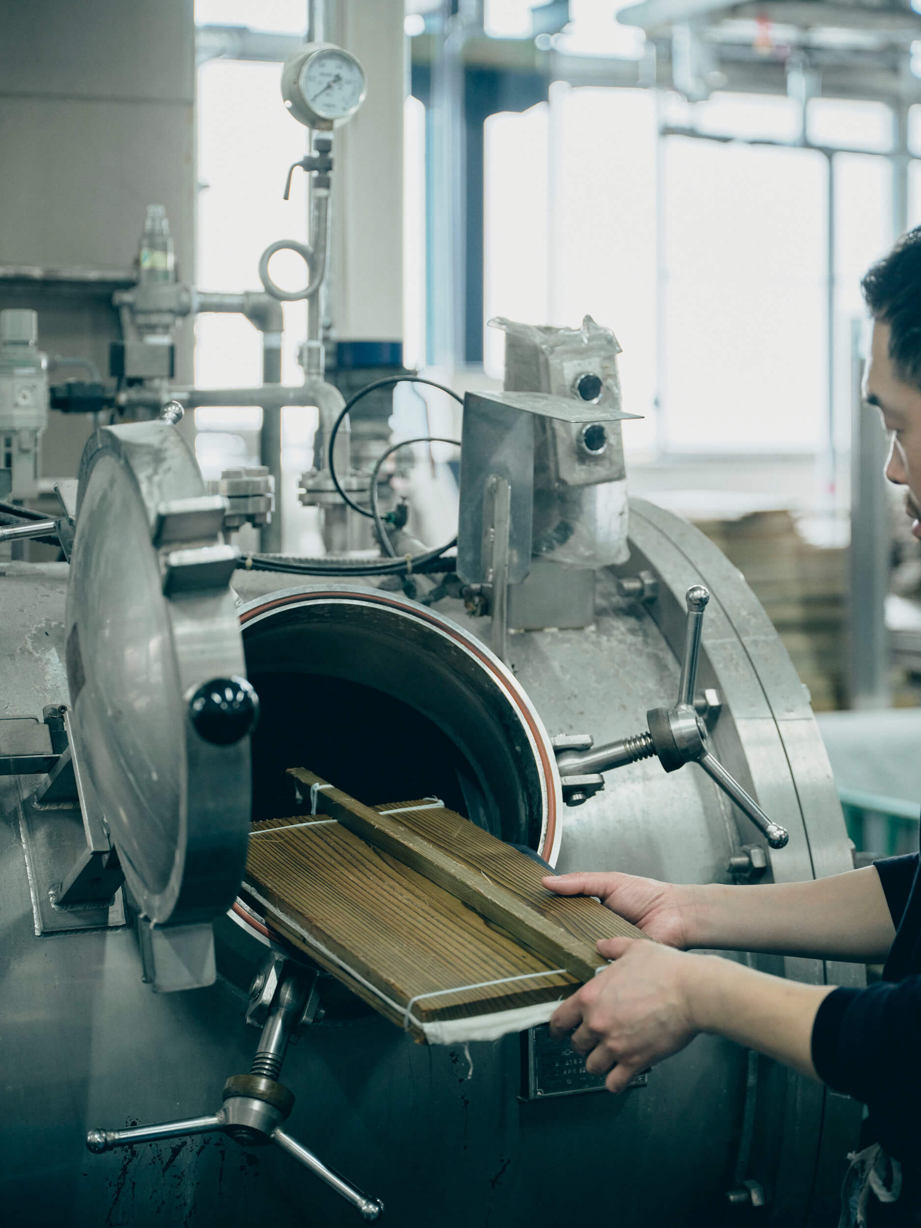 The shirt is then placed in a kiln for about 90 minutes for dyeing and washing. Wooden boards, rather than plastic, are used for practical reasons: the wood absorbs water during dyeing and expands, tightening the press further. Its flexibility also prevents damage to the fabric.