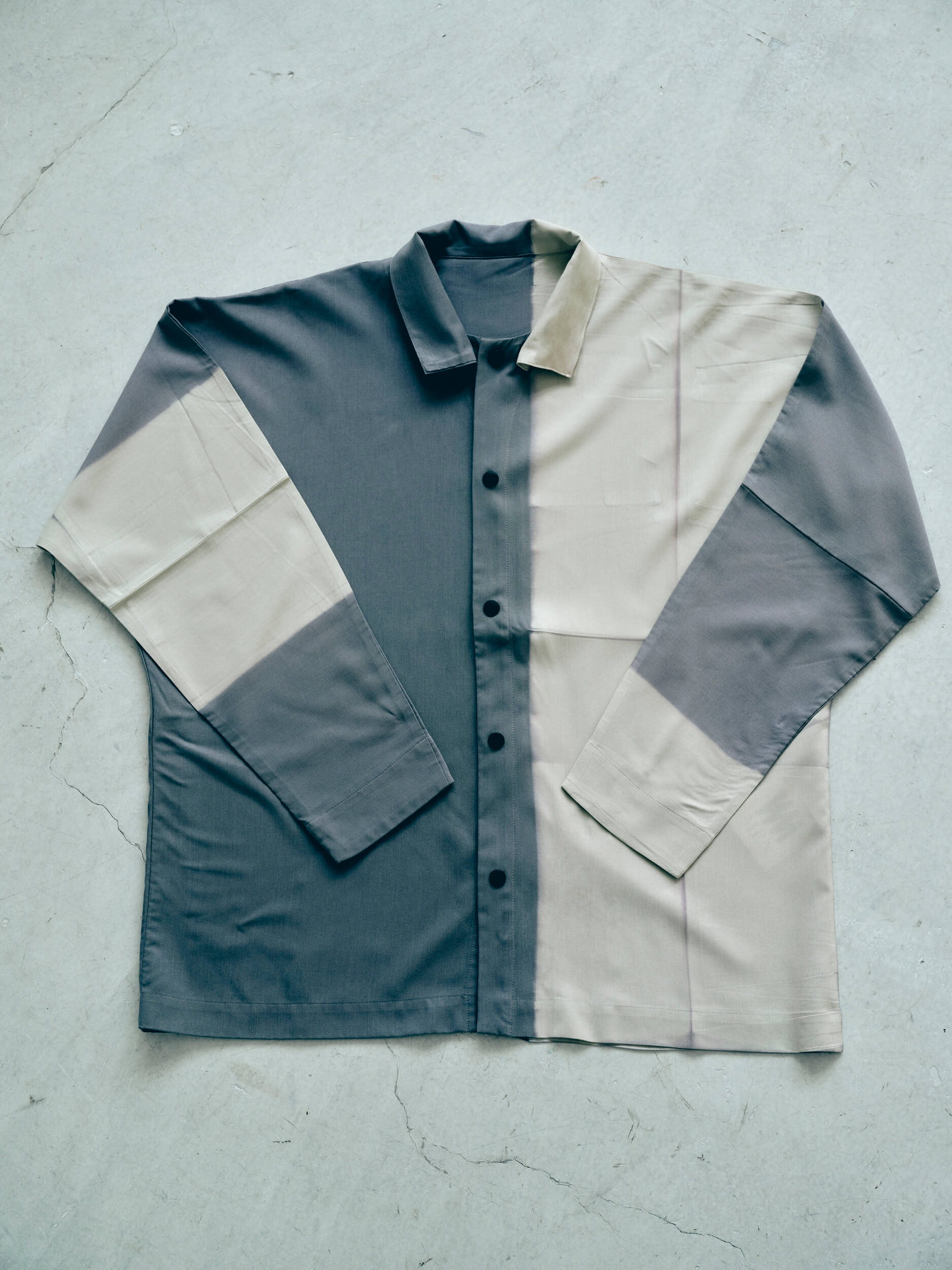 When the dyeing is complete and the shirt is removed, the pressed sections remain beautifully undyed, creating a striking block-color pattern. The boundaries between the colors are subtly blurred, giving the design an organic, handcrafted quality. This seamless execution is made possible by the Compact Shirt’s flat-fold design, which complements the itajime technique. The combination of Issey Miyake’s innovative textile technology and this traditional craft results in a harmonious and striking final product.