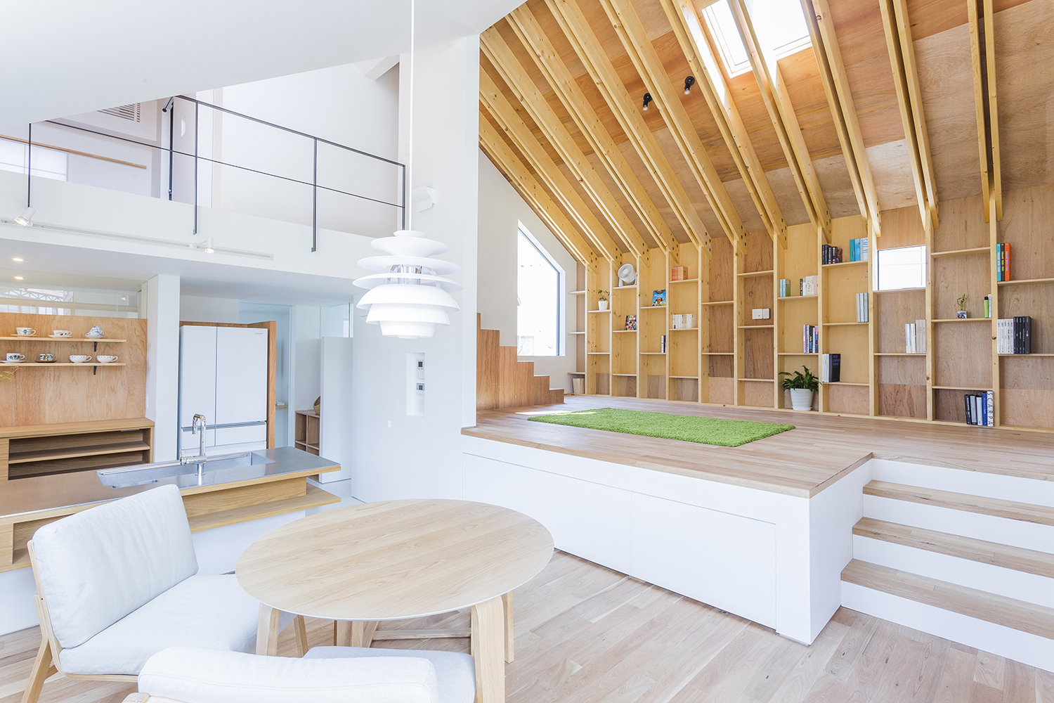 Inside, wood and the colour white predominate, a minimalist design carried through by spaces that are not marked out according to their purpose but that adapt to the family’s lifestyle. Thus, the living room is in the centre, with a high ceiling, while two staircases lead to the children’s bedroom or that of the parents, neither of which have fixed partitions.