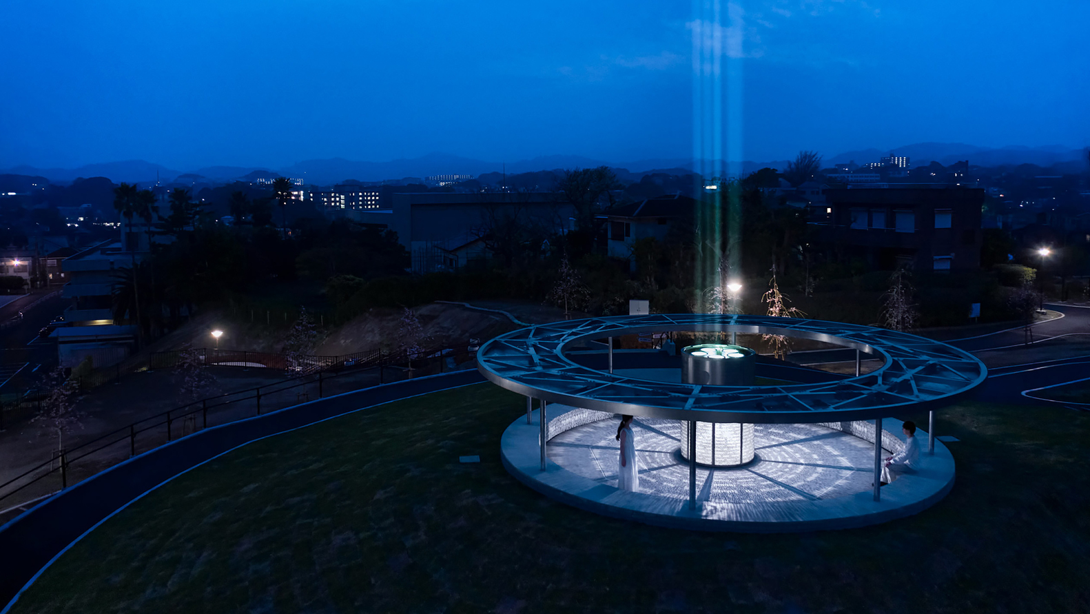 During the Second World War, the site was used as a military fortress by the Japanese army. Today, the public garden commemorates the Declaration Calling for the Abolition of Nuclear Weapons and the Status as a City of Peace. In conjunction with this tribute, the builders constructed, on a former weapons emplacement, a structure in the shape of a circle, symbolising pacification. When night falls, it transforms into a turret that projects a beam of light, over one thousand metres long, towards the sky. Designed to be powered by a generator, the axis serves as a lighthouse for the citizens, or an evacuation site in the event of a natural disaster.