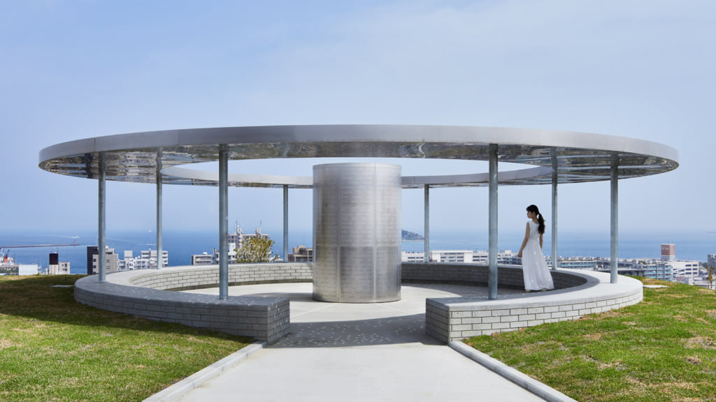 During the Second World War, the site was used as a military fortress by the Japanese army. Today, the public garden commemorates the Declaration Calling for the Abolition of Nuclear Weapons and the Status as a City of Peace. In conjunction with this tribute, the builders constructed, on a former weapons emplacement, a structure in the shape of a circle, symbolising pacification. When night falls, it transforms into a turret that projects a beam of light, over one thousand metres long, towards the sky. Designed to be powered by a generator, the axis serves as a lighthouse for the citizens, or an evacuation site in the event of a natural disaster.