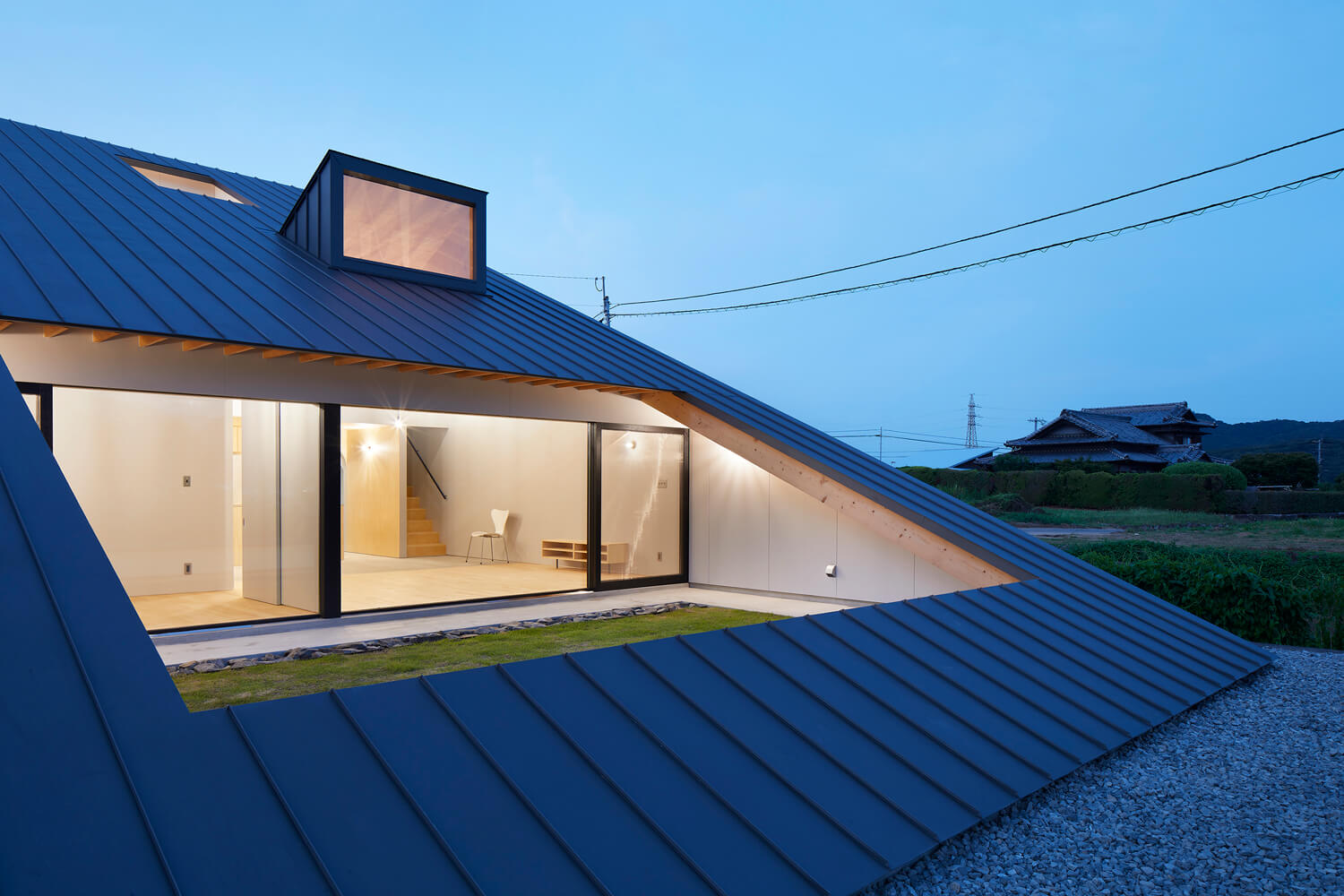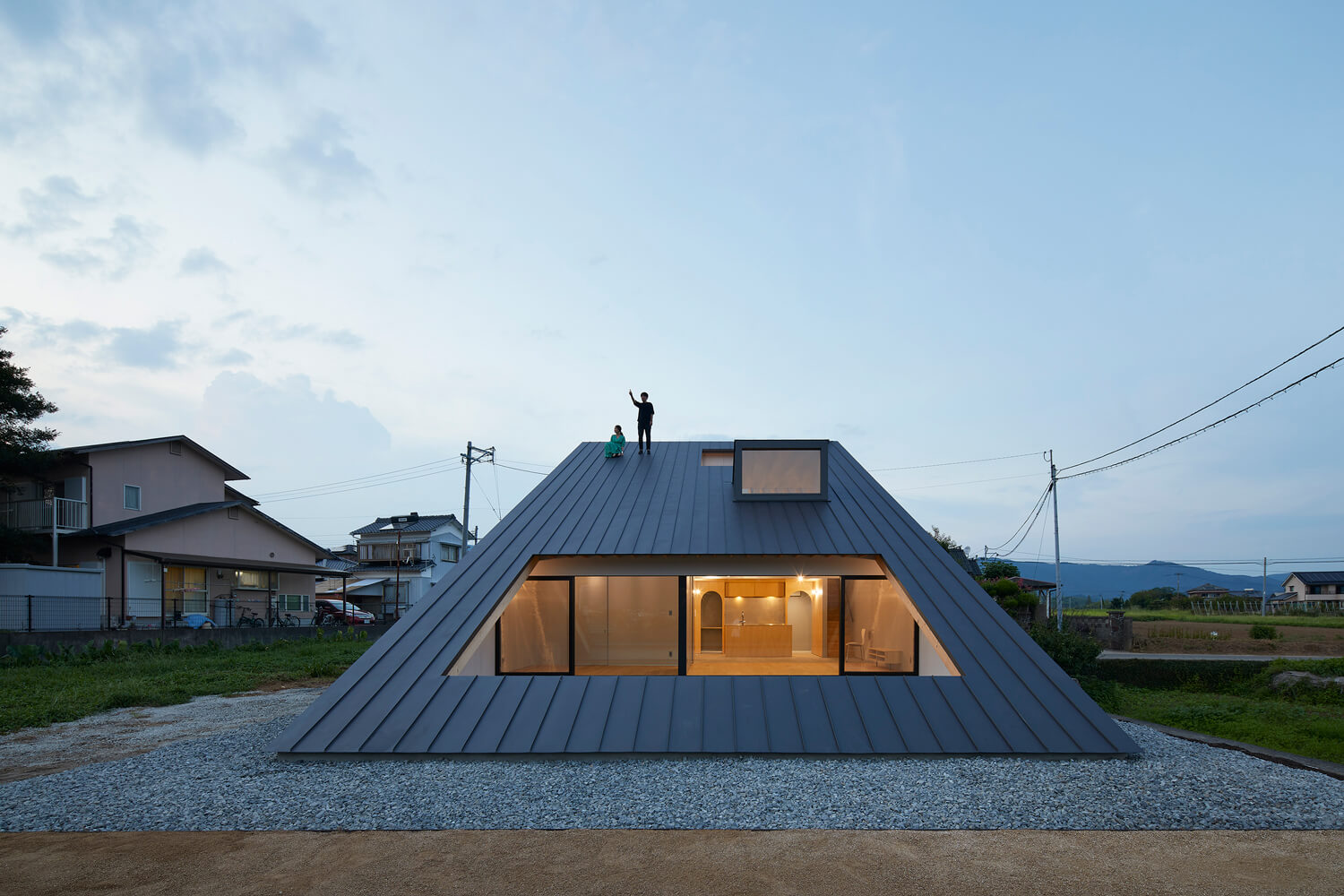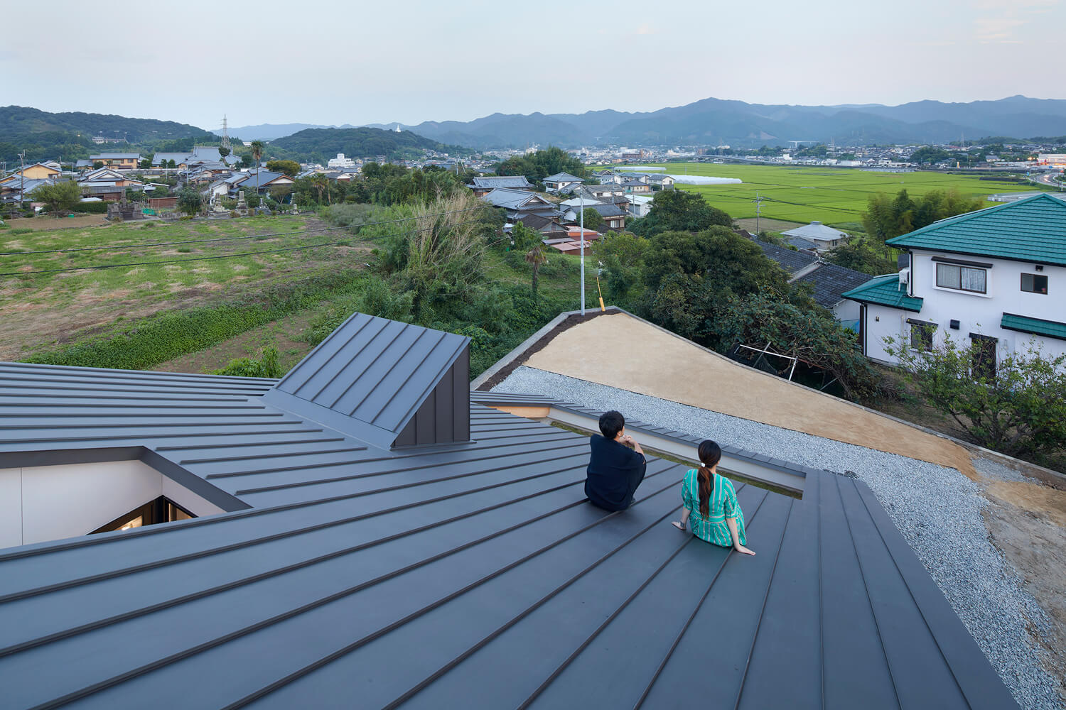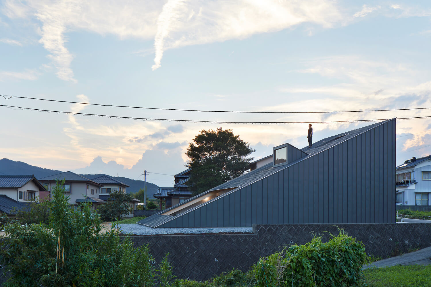 While Usuki on Kyushu Island is known for its stone buddhas, it could equally become famous for its façade-less house, whose gently sloping roof (24 degrees) meets the ground directly. The low degree of this slope makes it possible to climb onto the roof to sit there and admire the surroundings, which are filled with soaring reliefs and sloping plains. Its architecture, which stands out among the more traditional houses around it, was designed to allow its inhabitants to make the most of the landscape while respecting it.