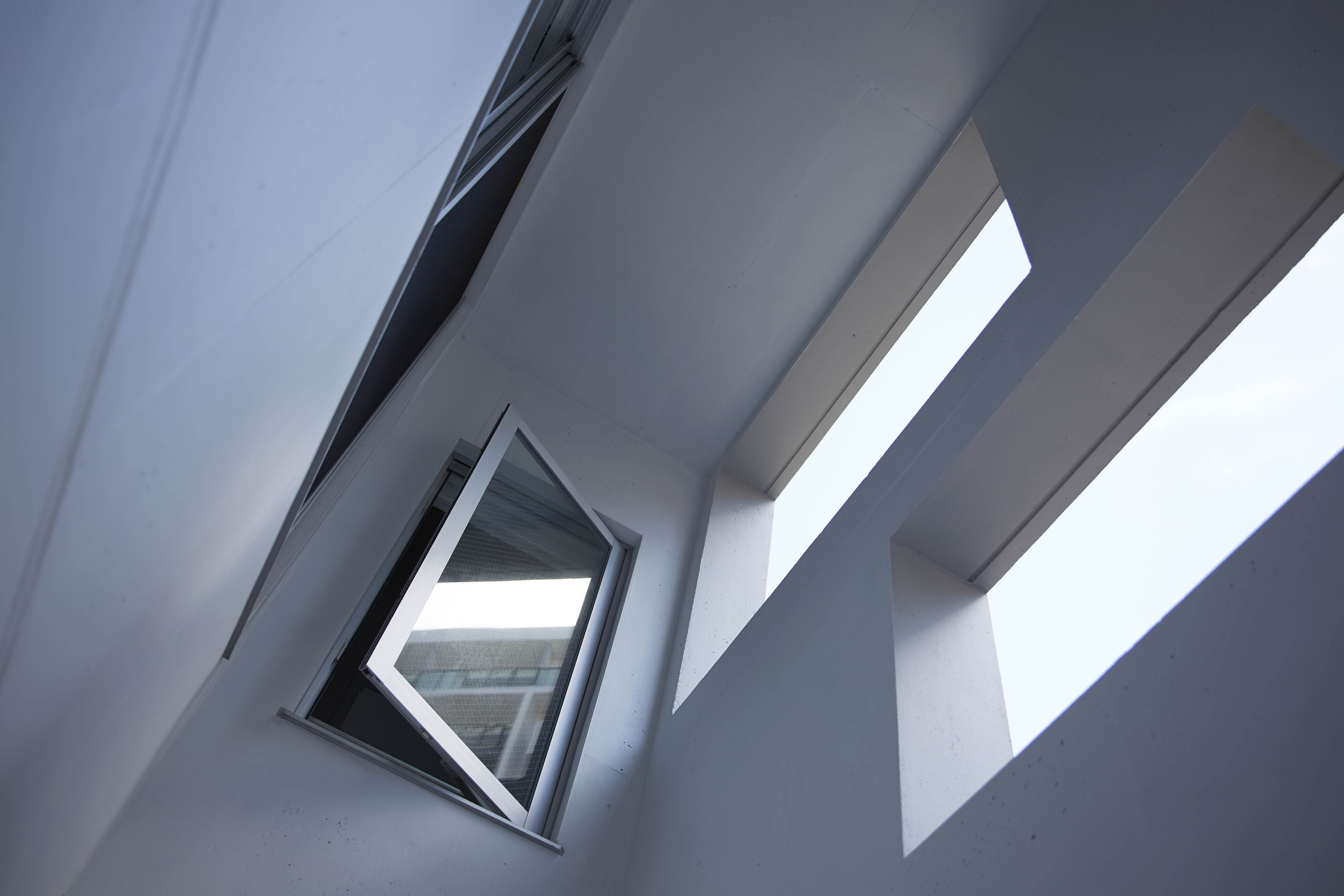 The inside space offers a clever combination of rough concrete and white surfaces, with various wooden items of furniture. The architects also designed what they describe as ‘useless places’: rooms with no predestined function, shared by the two families and that each inhabitant can use as they see fit. Lastly, the pair also designed the stairs, both inside and outside, to act as areas that can be shifted from their primary use. Thus, the large steps can serve as a space to chat, work, or watch what is going on on the street below.