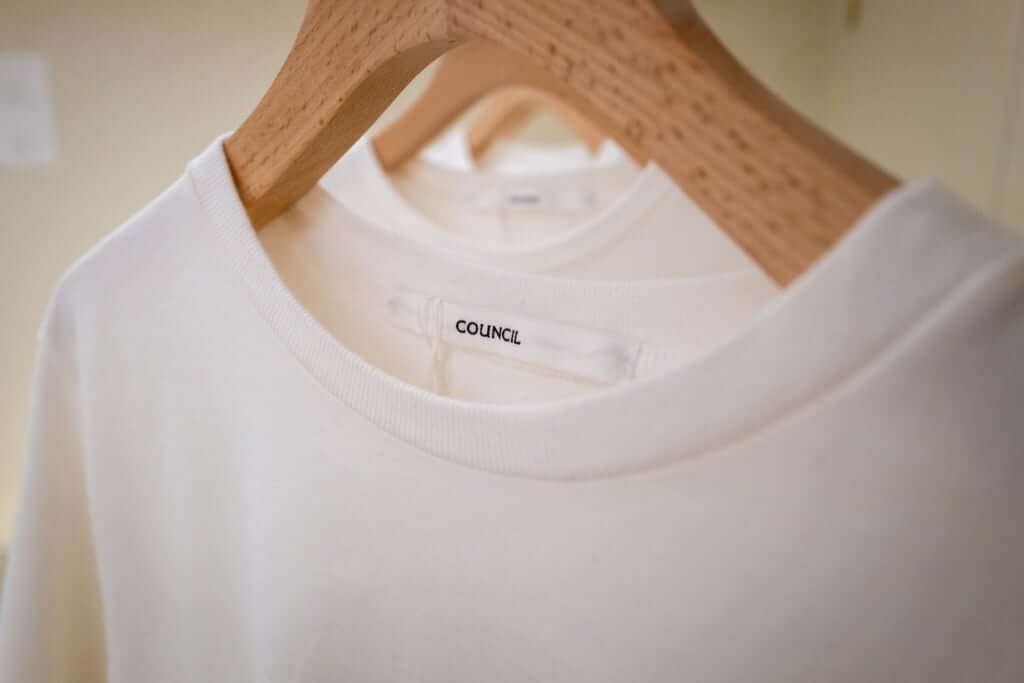 ‘With Council, I want to create refined everyday wear for adults,’ says Kitagawa. ‘This time, I wanted to design a white T-shirt that adults would actually want to wear, so I gave the sleeves a longer length for a more elegant silhouette. I think it turned out to be a white T-shirt that works as a standalone piece.’