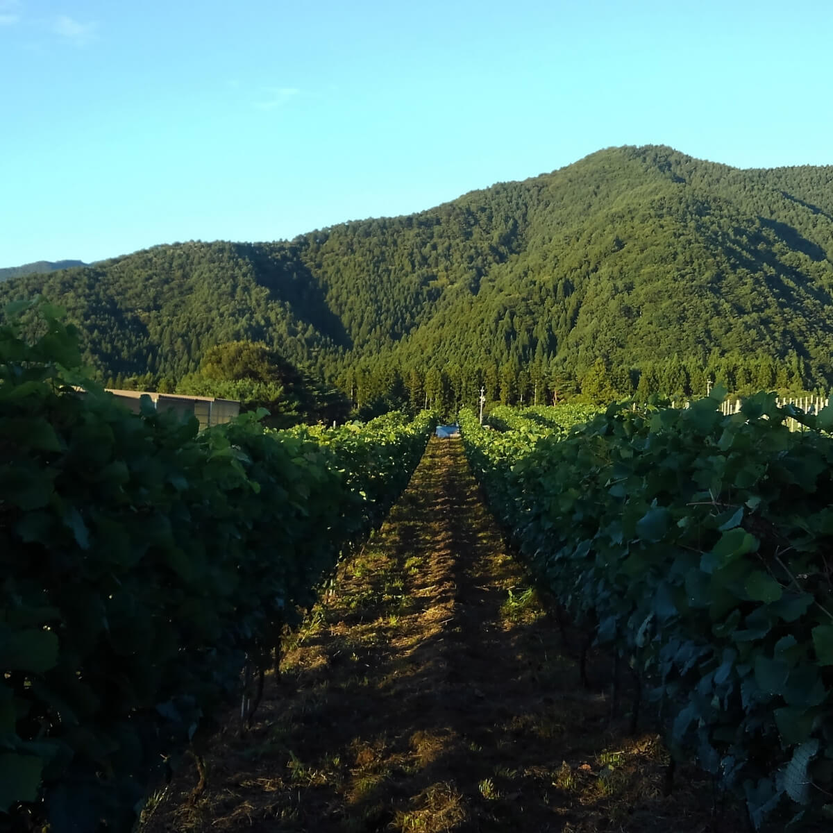 Fukuihara is in Takayama-mura, located on the right side of the Chikuma River that runs south and north through the northern part of Nagano Prefecture. The fields in this village are often cut into fan-shaped plots shaped like Japanese fans, and Fukuihara is at the tip of the fan shape, at an altitude of 790-850 m (2550-2750 ft.). Among Japanese vineyards, this is categorized as a cool climate vineyard.