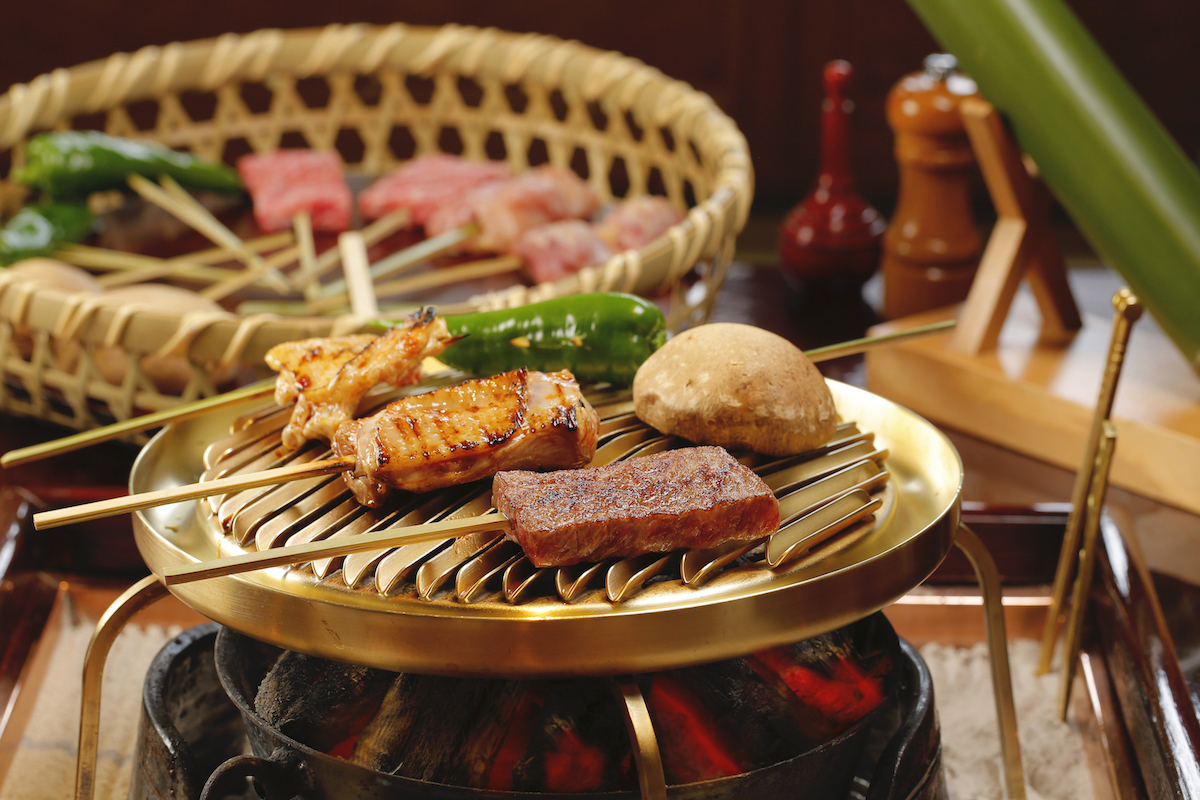 When the restaurant was founded in 1964, the menu focused on wild birds, but in recent years, the specialty has become chicken, prepared in one of two ways: irori-style, cooked over a sunken hearth (irori in Japanese) and flavoured using the teriyaki method, which combines the sweetness of sugar with the savouriness of soy sauce; and sumibiyaki-style, in which the chicken is thinly sliced and flavoured with sesame oil and yuzu pepper. Serving a course menu only, Ukai Toriyama treats guests to appetisers of wild plants, followed by hot pot, then grilled vegetables—such as shiitake mushrooms and shishito peppers—grilled meat, and finally—the traditional rounding-off of any Japanese meal—rice.