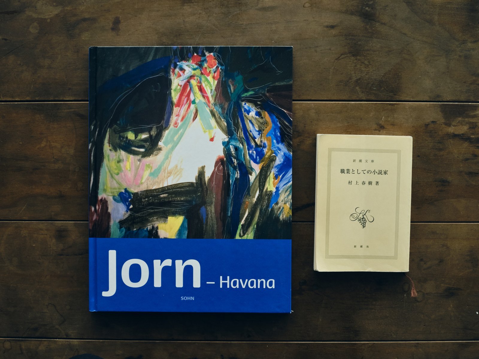 Two sources of inspiration. On the left, a collection of works by the painter he admires, Asger Jorn. On the right, ‘Novelist as a Profession’ by Haruki Murakami.