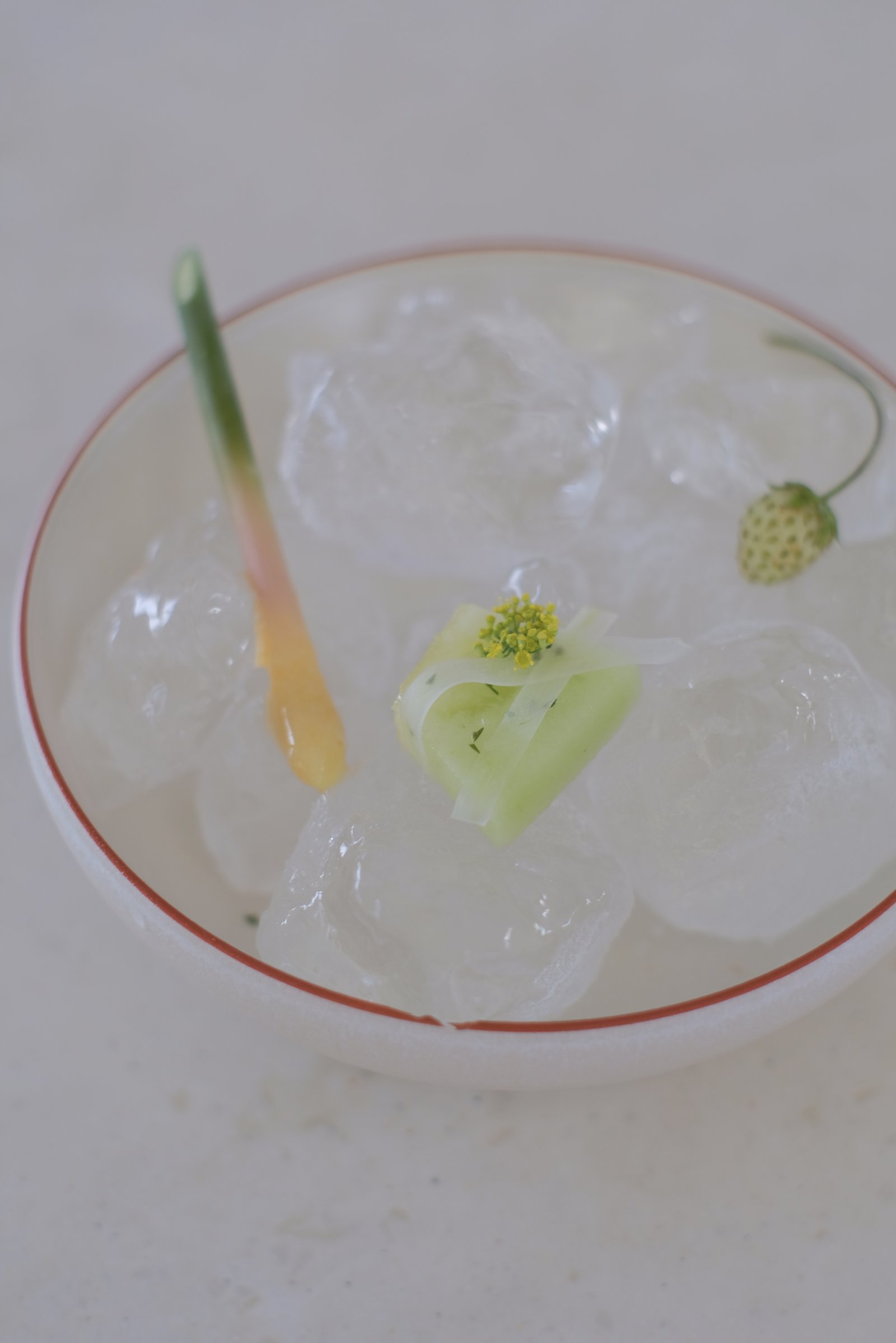 One of his recent favourite creations. From left to right: Yanaka ginger coated with physalis purée, melon topped with Nikko fir, and a lightly pickled green strawberry—a delicate, almost painterly composition.