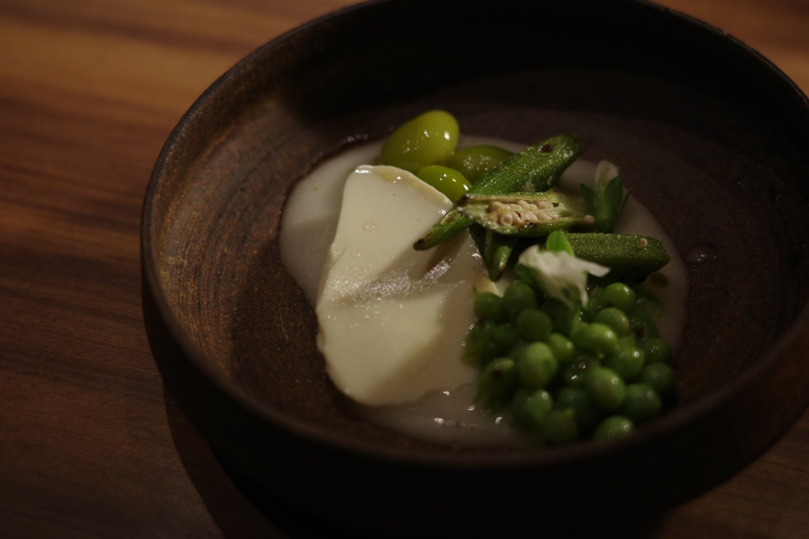 At the pop-up held on August 31 and September 1 at eatrip kitchen, he presented nine dishes themed around a ‘journey of flavours’. Pictured here: a dish inspired by the green hues of the vegetable garden—green soybean tofu, okra, and teardrop peas.