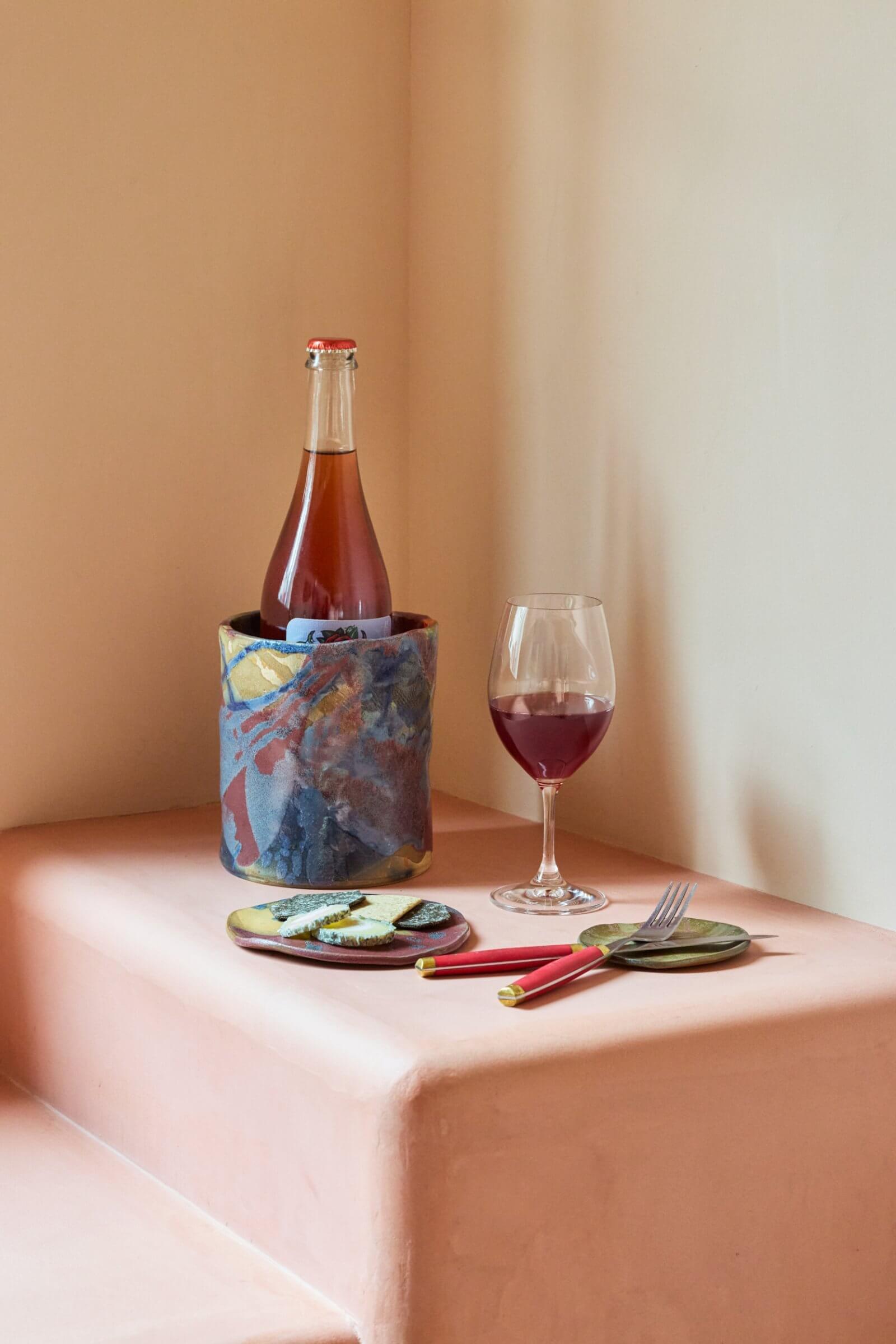 Glasses of wine start from ¥1,300. Let the sommelier choose according to your preferred flavor or region. Ceramics and wine coolers handmade by Katy add color to the table.