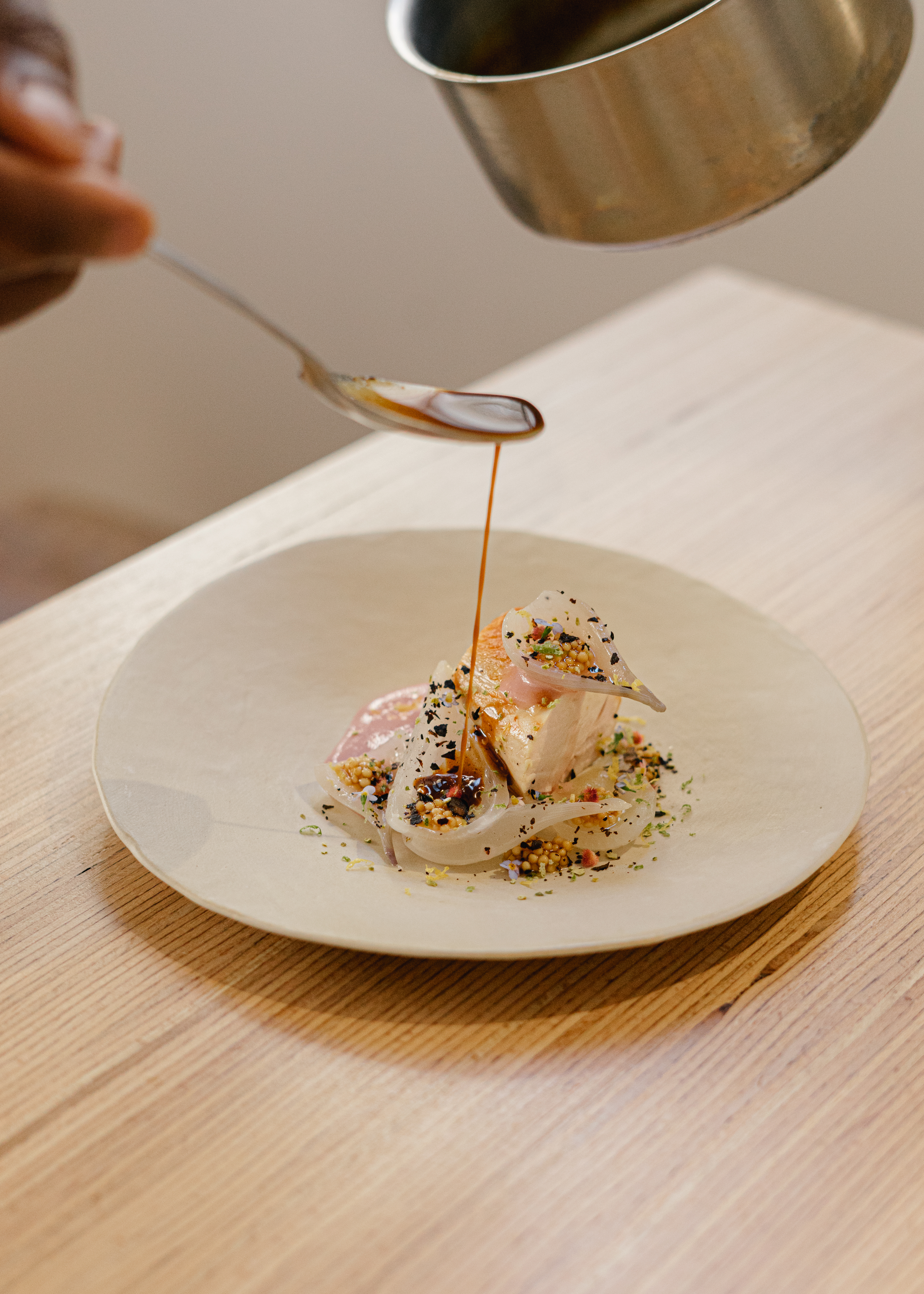However, he turned his attention towards French haute cuisine for his training, joining chef Hans Zahner’s team at the Royal Monceau at the age of 19. The palace welcomed a branch of Matsuhisa, the famous establishment by chef Nobu Matsuhisa. While there, Mory Sacko discovered the rudiments of Japanese cuisine, like how to make a dashi broth or use miso. Later, alongside Thierry Marx and his primarily Japanese brigade at the Mandarin Oriental, he honed his approach towards dashi and became acquainted with Japanese techniques like cooking on charcoal binchotan.