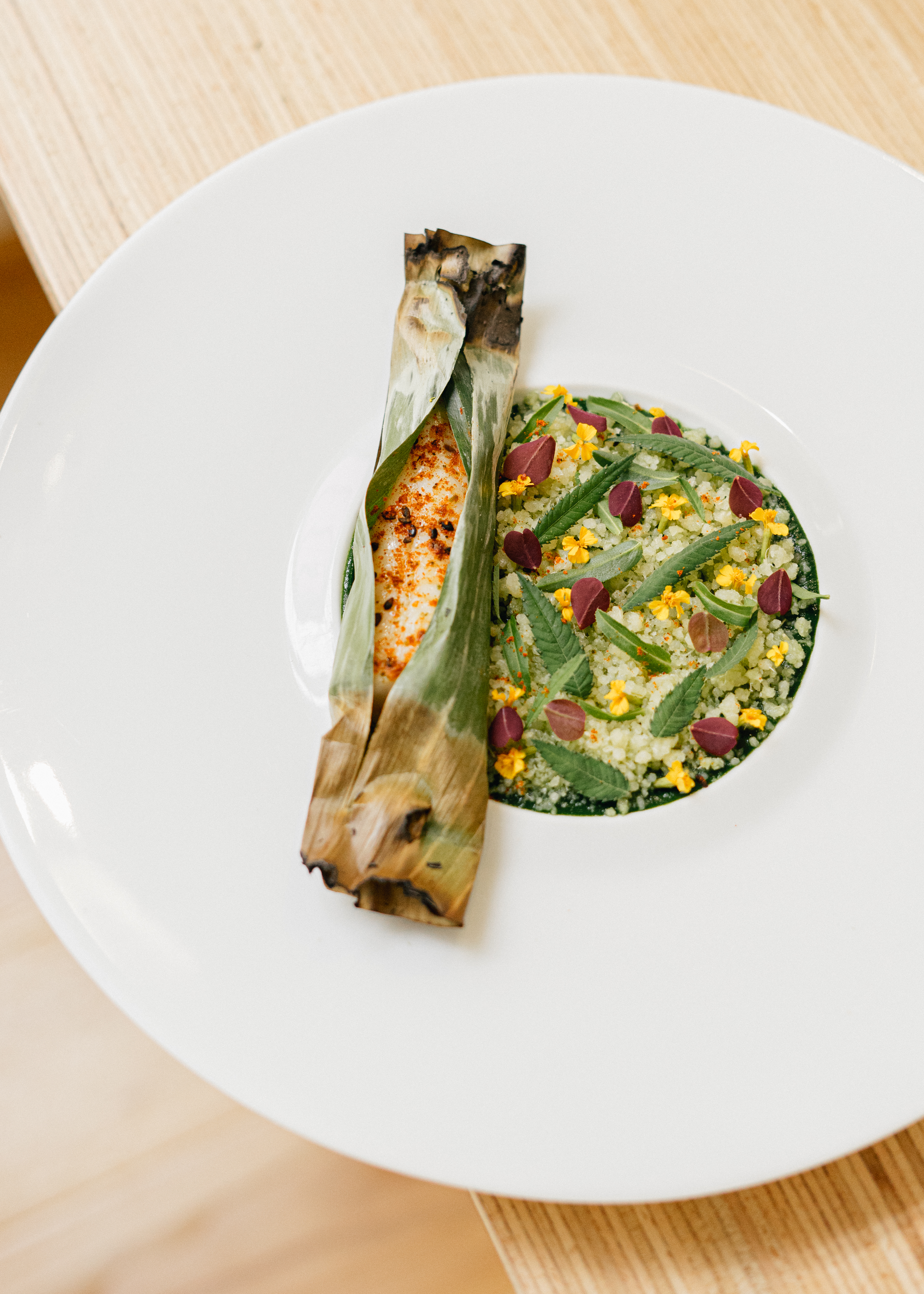 Sole in a banana leaf, Attiéké, ‘togarashi shichimi’ and lovage © Quentin Tourbez