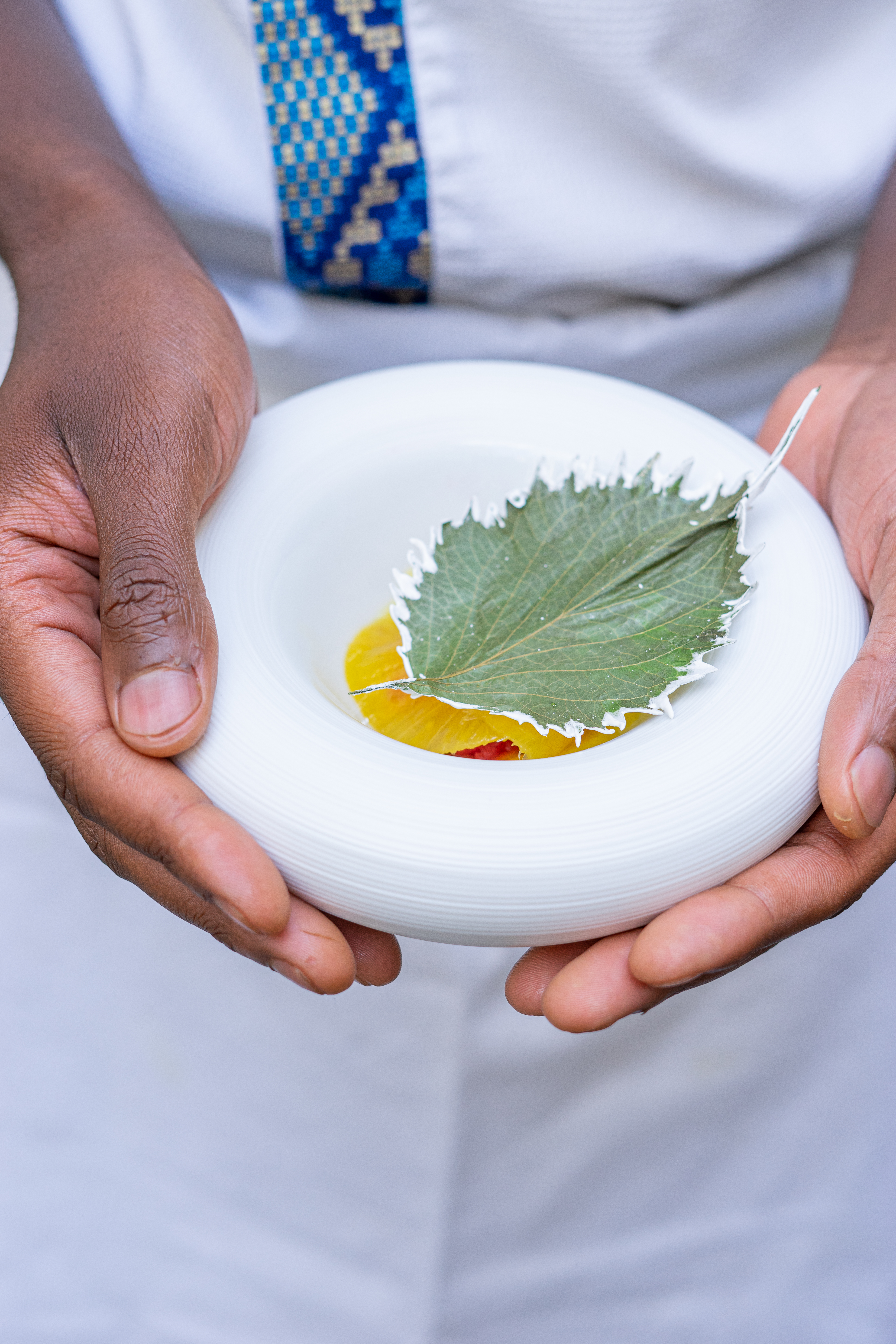Mory Sacko works on the basis of his products and thus takes a seasonal approach. He continues to extend the repertoire of his African-Japanese skills, for example by working to develop a harissa made from nori seaweed, ‘a balancing act to ensure that the flavour of the nori is not suffocated by the chilli’, he explains. He also reinvents other well-known dishes like Ivorian Pèpè Soup, a strong soup made with chilli but reworked here so that the infusion has the same density and sweetness as a dashi.