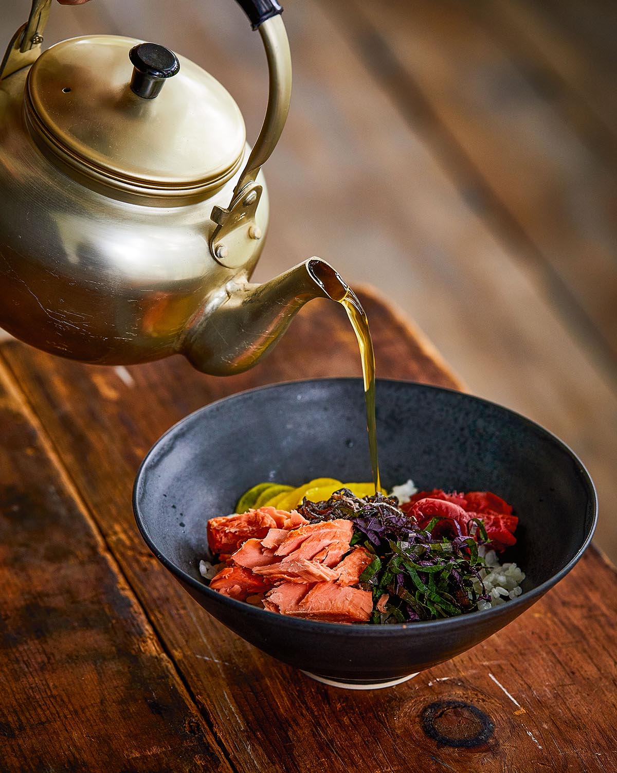 The American chef, known for his ramen recipes, shares several of his favourite dishes in The Gaijin Cookbook. One such example is ochazuke, a dish that involves pouring a green tea broth over a bowl of rice that can be garnished. ‘It’s a terrific way to pull together a snack from leftovers, or you can go a more indulgent route with fresh fish and seafood’, the chef explains in the first few lines of his recipe. ‘Ochazuke can easily be kept vegetarian by topping it with things like seasoned spinach, mushrooms or salted seaweed.’