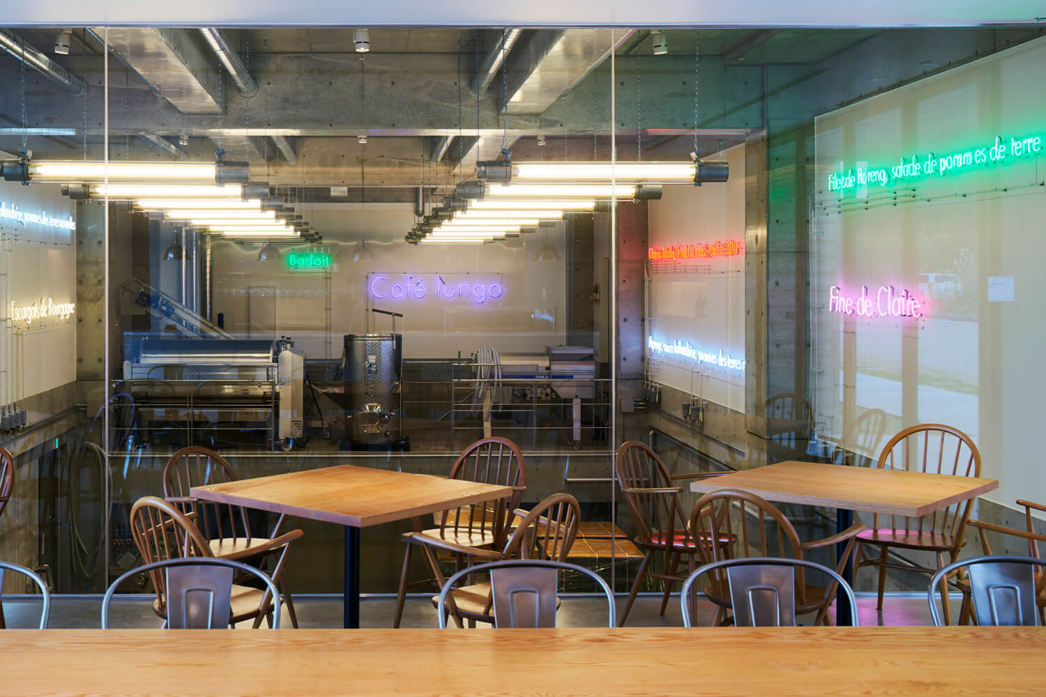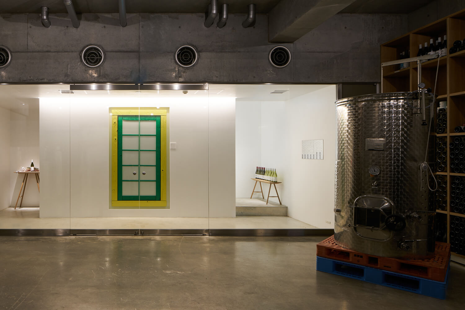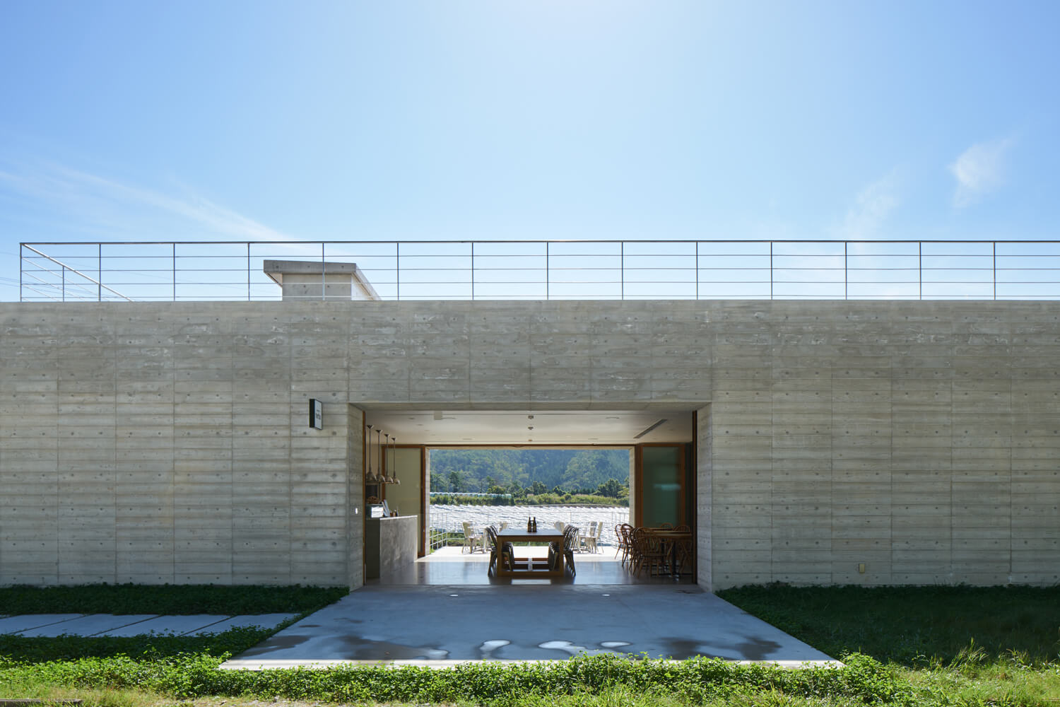 Visitors can enjoy taking a walk around before stopping for a break to taste the produce in the café-restaurant overlooking the vineyards. Designed by Masamichi Katayama from the Wonderwall agency and made from exposed concrete, it contrasts with the natural environment that surrounds it. The interior brings the two elements together, however, with wood combining with grey mineral tones.