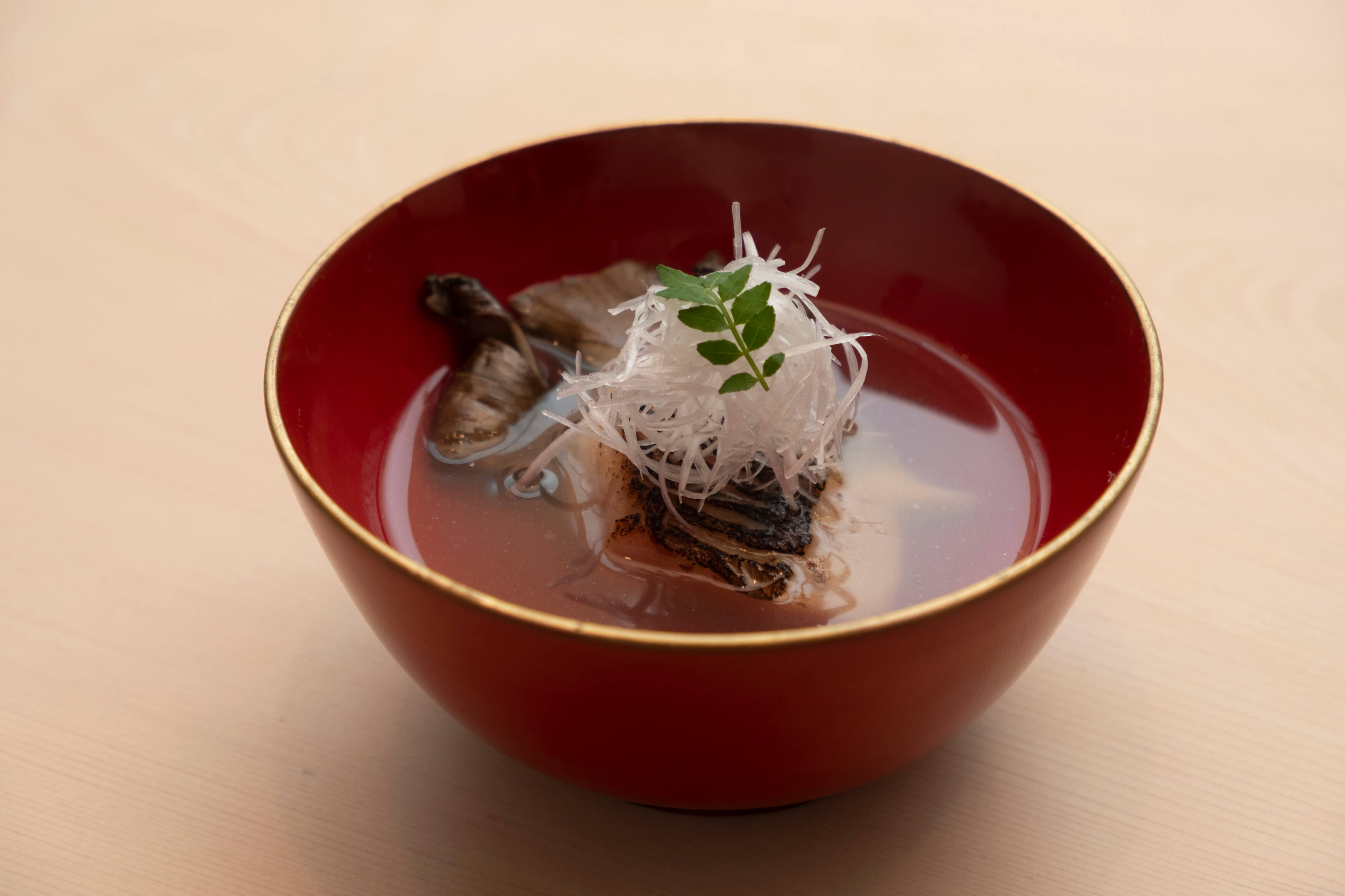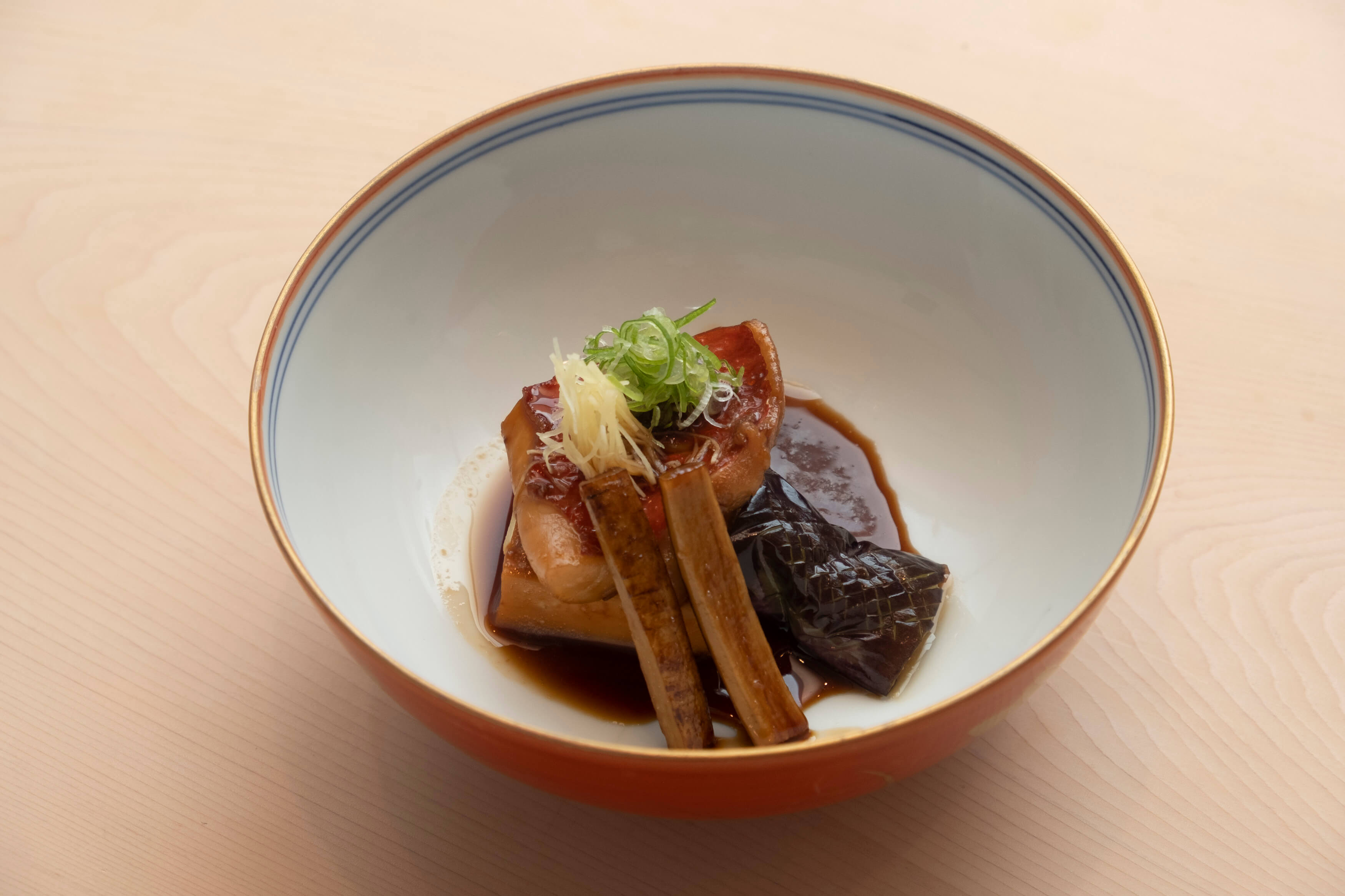 The old-school menu offers full-course dinners starting at ¥10,000, based on seasonal ingredients. Most of the cuisine on offer has been enhanced in some way by dashi prepared from various ingredients. The conventional Japanese meal featuring a first course of soup, with dashi prepared from katsuobushi (smoked skipjack tuna flakes) or kombu (kelp), is de-emphasized in favor of accentuating the savory umami specific to that ingredient.