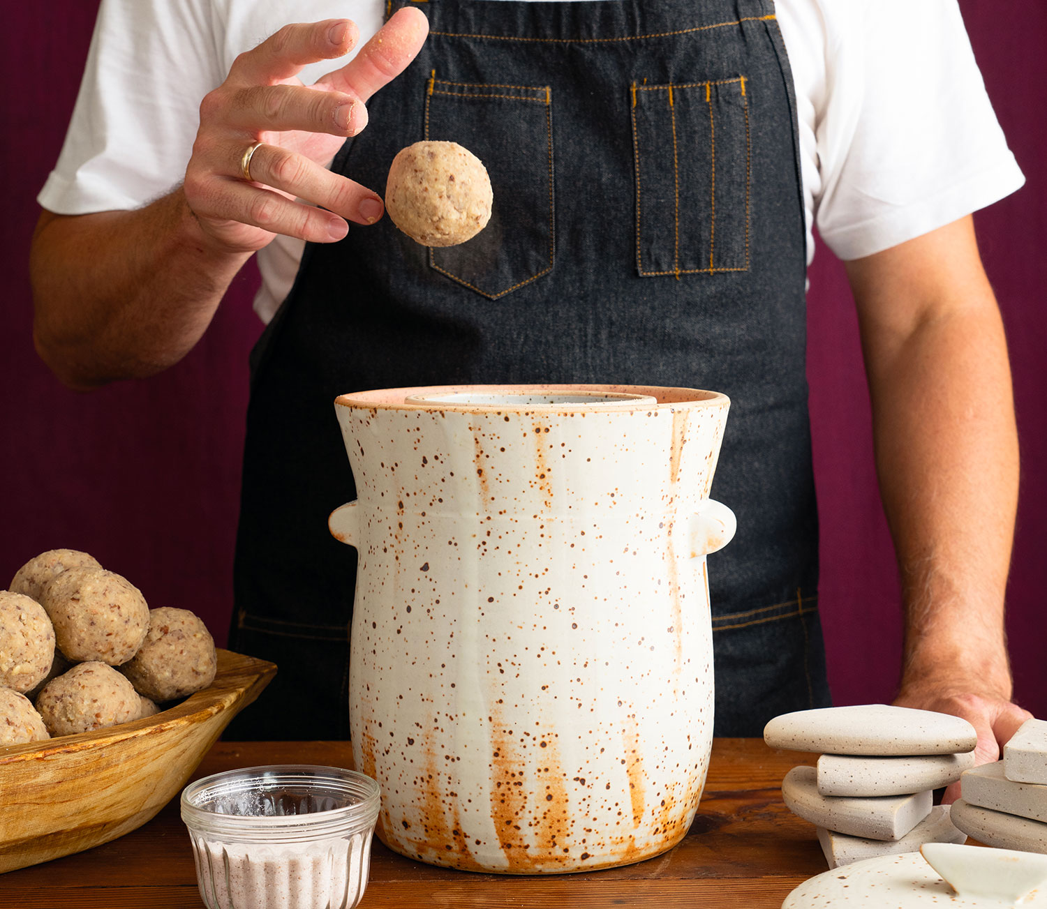 Pack the miso into the vessel, a spoonful at a time, tamping as you go to remove any air pockets. Or, form the miso into small balls and toss them firmly into the vessel to minimise air pockets.