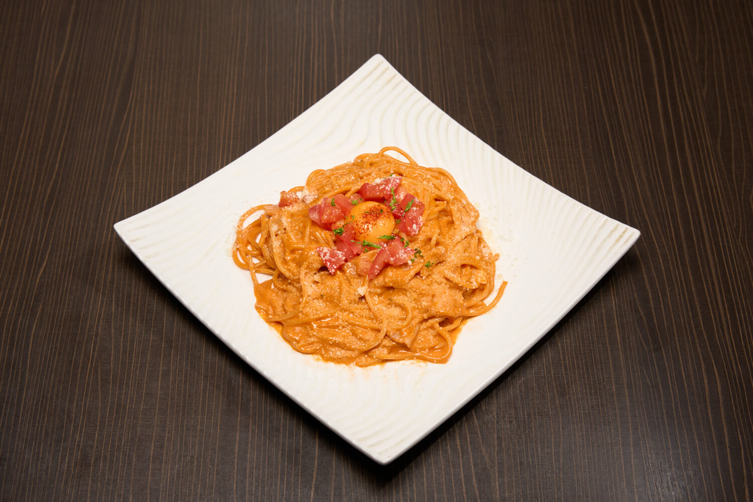 The restaurant has many repeat customers, but Attanetius’s creamy “TOMATO DE LUCE CARBONARA” in particular is so well loved that the repeat order rate exceeds 90%. Despite their richness, the added tomatoes impart a delightful hint of acidity that lends a refreshing quality to the dish. The interplay of flavors from the black pepper along with the bacon, contributes to an overall exquisite culinary experience.